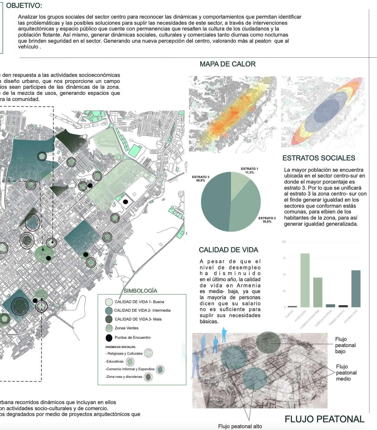 The project seeks to recognize the art and history of Cuyabran culture, but in addition to this, the integration and permanence of the community in the sector is sought through the architectural object and urban design, generating in the center of Armenia facilities that allow different activities to be carried out on a day-to-day basis that in turn provide security and a new context to the Quindian capital as a tourist, cultural and commercial district, changing the image of the sector as the Armenian store. This projection is proposed for the year 2050, so that Armenia is at the level of the great capital cities in Colombia leaders for the , economy, culture and appropriation of space.
