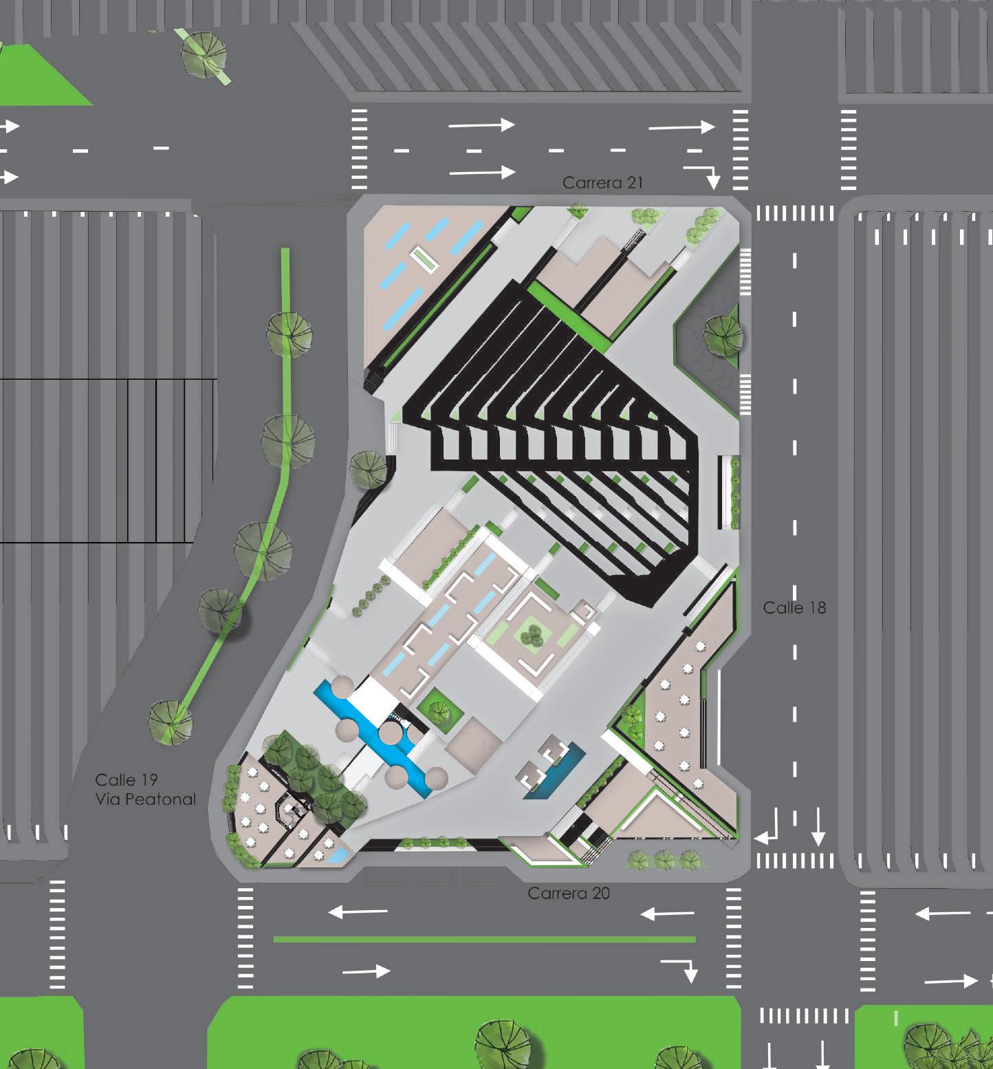 Se pretende unir los dotacionales y fragmentar la carrera 19 para que deje de ser la barrera principal que mantiene desconectados los dos centros de ciudad. Se plantean una serie de calles peatonales que atraviesan el oriente y occidente de la ciudad. Estas peatonales tambien estarian dotadas de estrategias de desarrollo de espacio publico para que la ciudad pueda descontaminarse del papel fundamental que se le da al vehiculo actualmente.