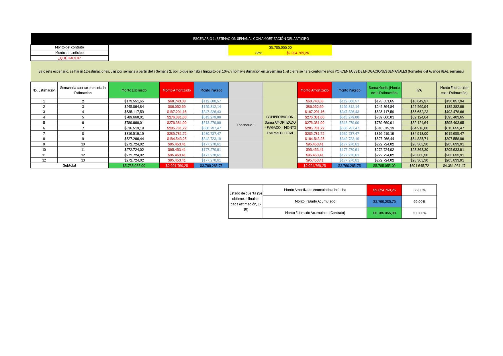En el escenario 1 se contemplan 12 estimaciones, iniciando desde la semana 2 con una por semana. No se incluye una estimación para la Semana 1 ni se aplicará el finiquito del 10%. El cierre se realizará utilizando los porcentajes de erogaciones semanales, basados en el avance real de cada semana.
