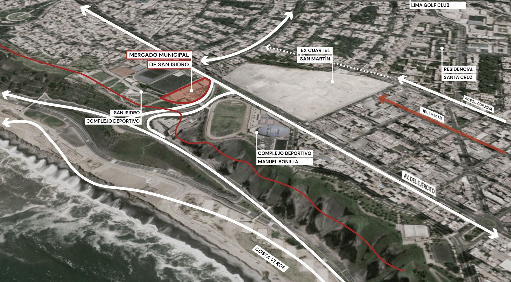 El terreno elegido se encuentra adyacente al malecón de la Costa Verde, en el distrito de San Isidro límite con Miraflores, en el antiguo Mercado de Productores. El hecho de encontrarse en un punto medio entre dos distritos tan importantes fue un factor importante para la elección del terreno, además de su cercanía con la Av. La Mar, zona en constante consolidación como nodo cultural-gastronómico de la ciudad. También es un entorno natural al estar en un punto medio que encuentra, actualmente poco comunicado y sin integracion entre los malecones de ambos distritos.