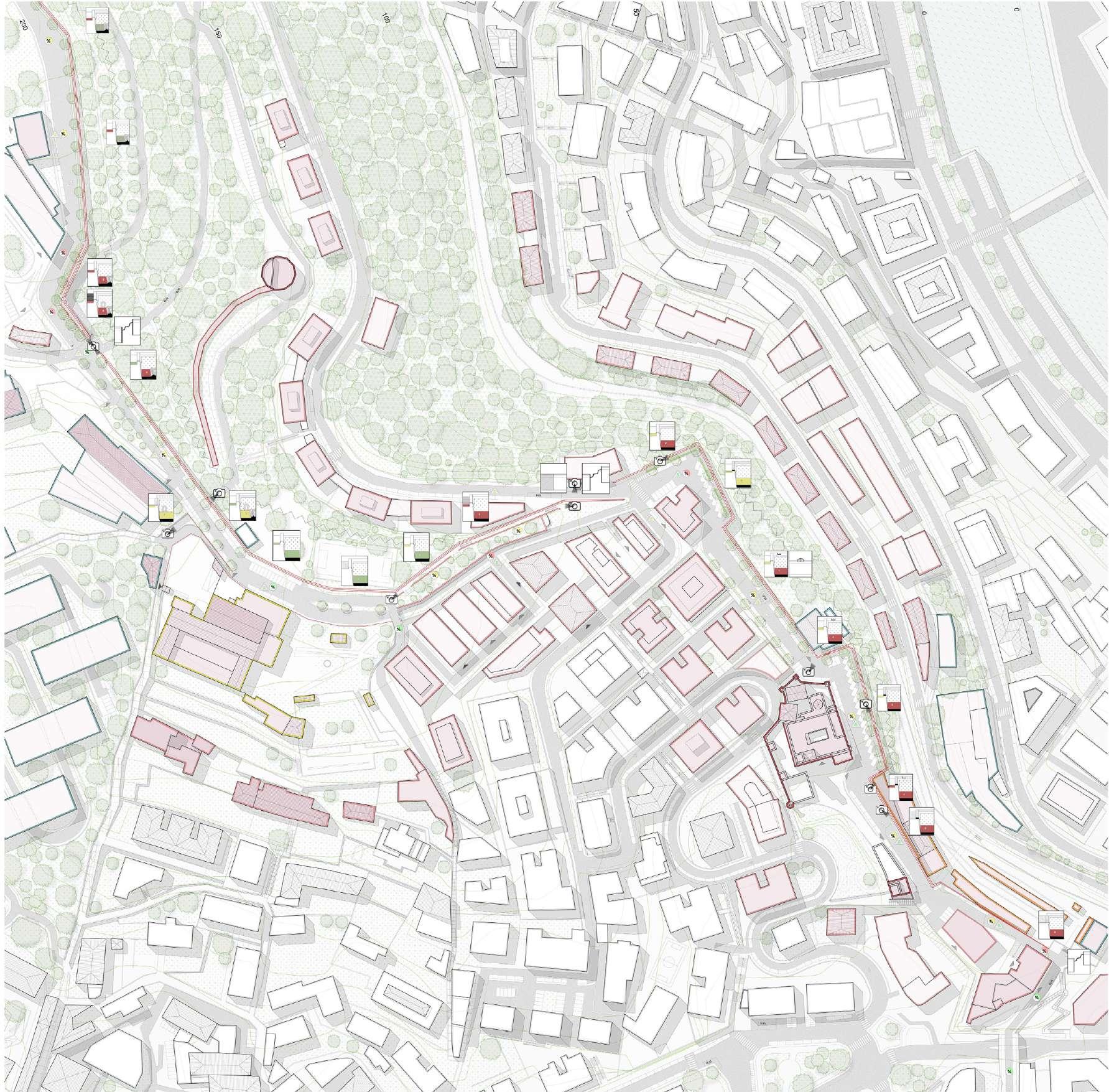 Alla nuova piazza pubblica è affidato il ruolo di primo motore della rigenerazione urbana del quartiere attraverso un edificio speciale che ospita funzioni collettive, che favoriscano dinamiche sociali, culturali e ricreative. Si è scelta scientemente un’altra strada rispetto a quella di individuare un memoriale simbolico rappresentativo concentrato nella nuova piazza: un’area afflitta da tempo da una situazione di degrado morfologico e sociale, che ha poi subito una tragedia di dimensione collettiva, non può portarne il peso attraverso una reificazione simbolica di significato all’interno della piazza pubblica che deve invece rappresentare il luogo di aspirazione ad un futuro di quotidianità rinnovata. Un memoriale concepito alla scala del paesaggio, che consenta un’interpretazione plurale della memoria come esercizio creativo dinamico: un insieme diagrammatico di percorsi disegnano il parco individuando 43 recapiti anonimi a simboleggiare l’equanimità nel lutto della comunità civile.