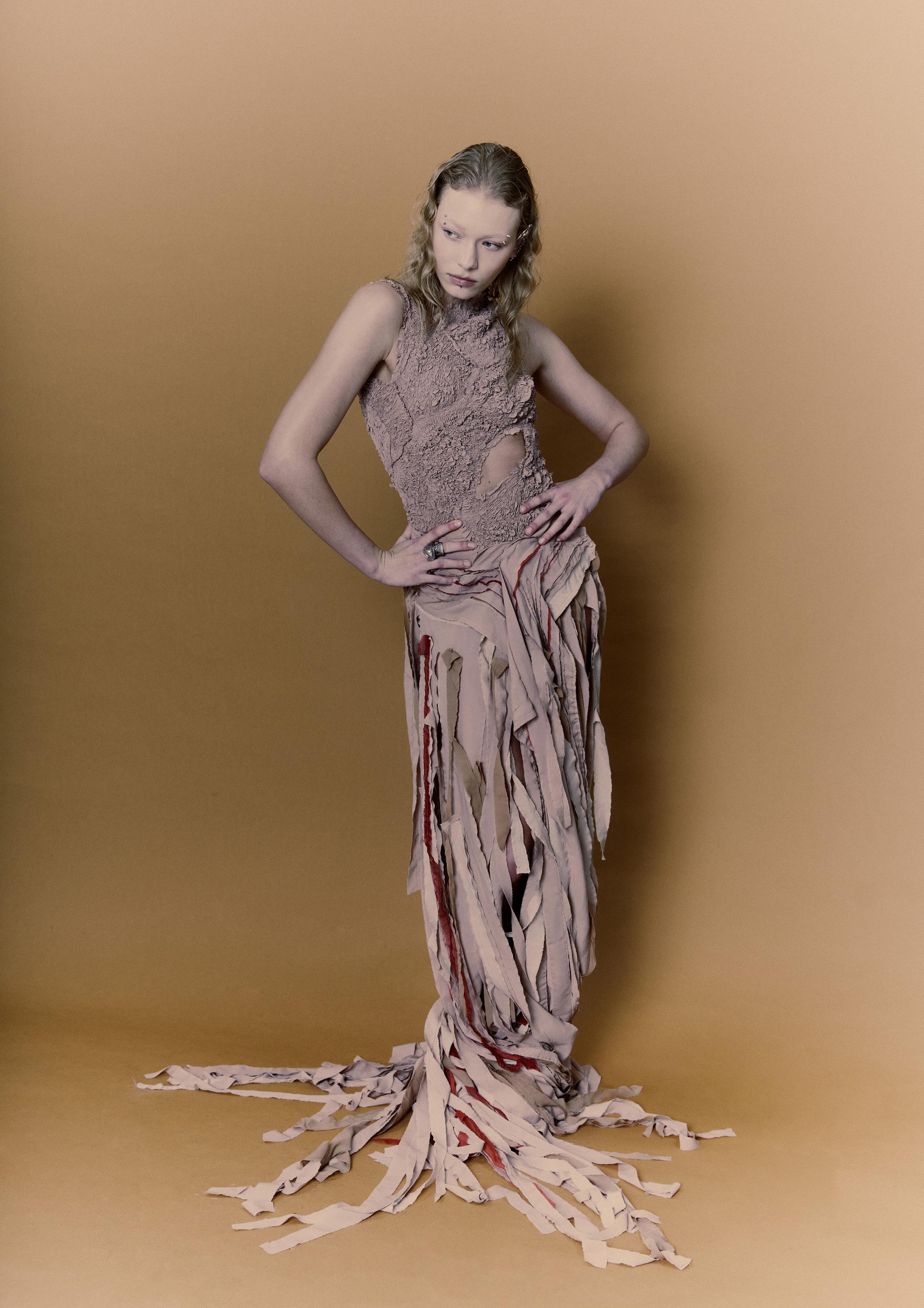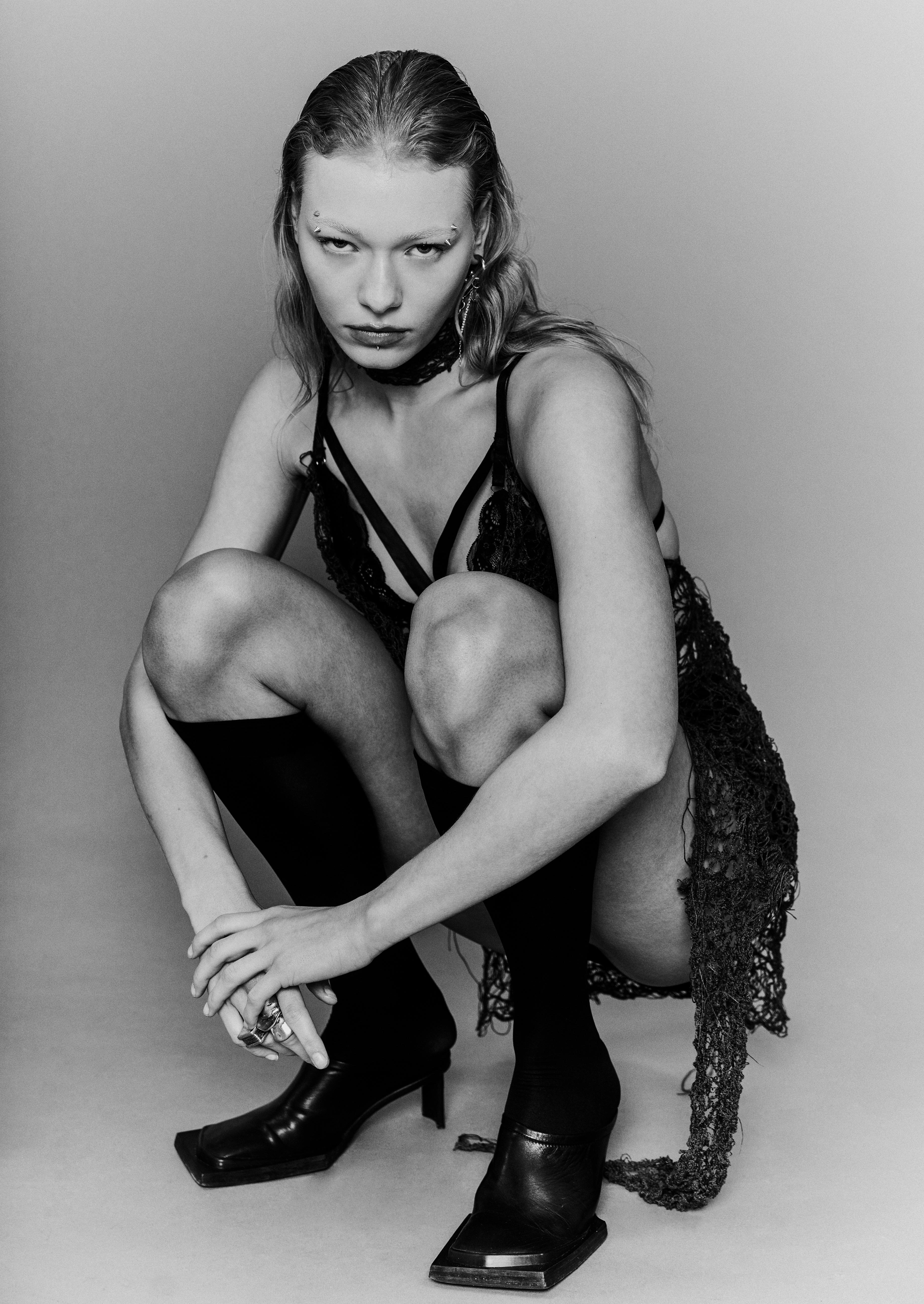 JARA. Dress, CARLOTTA CILLONI. Ear cuff, Ring, STYLIST’S OWN. In the next page. JARA. Dress,Choker, CARLOTTA CILLONI. Earrings, Bralette, Rings, STYLIST’S OWN. Tights, CALZEDONIA. Heels, MIISTA.