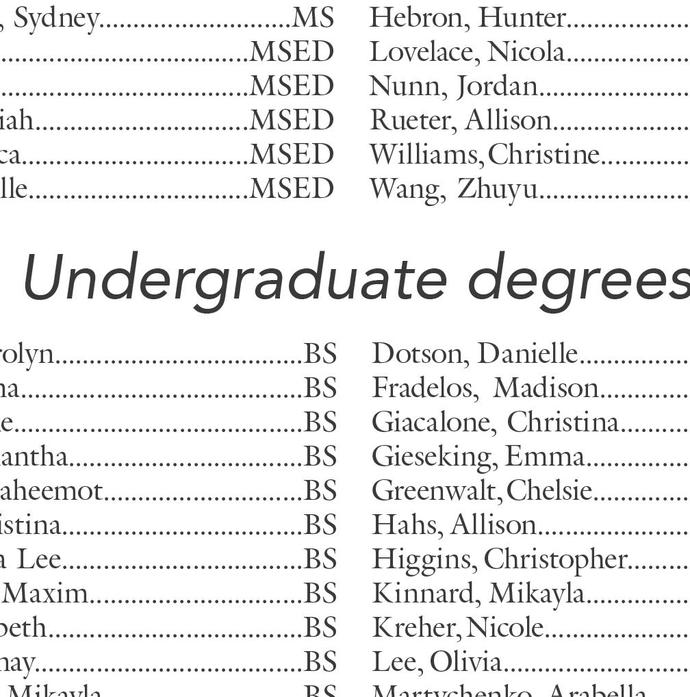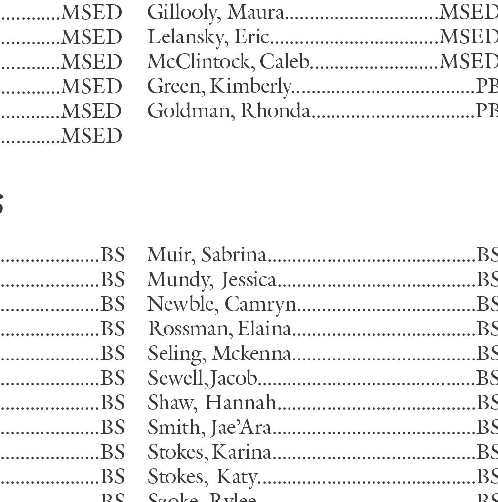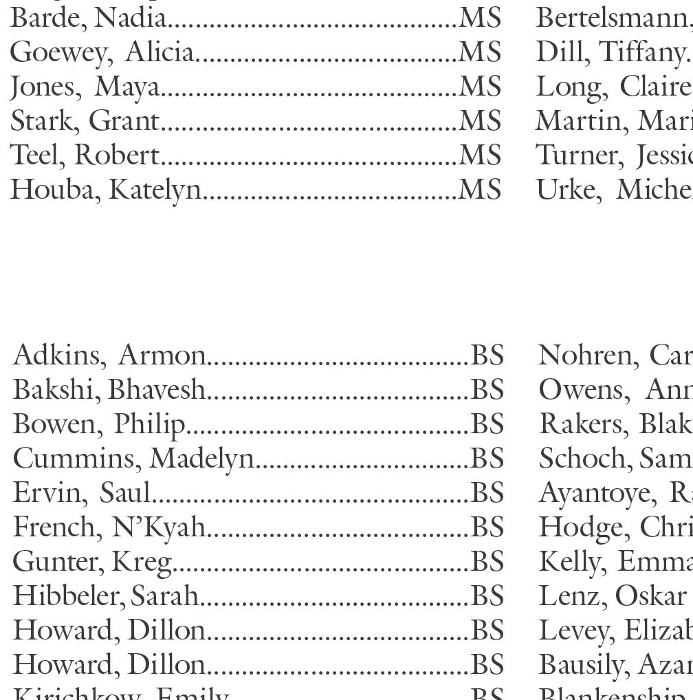 Pierson, Brett...............................................BS Regmi, Salina..............................................BS Rogers, Haley..............................................BS Sander, William..........................................BS Skelton, Baylee............................................BS Steed, Michael............................................BS Straube, John...............................................BS Young, Andrea............................................BS Zeller, Laren................................................BS Aylsworth, Justin........................................BS Brandon, Madeline.....................................BS Briskovich, Matthew..................................BS Coleman, LaMarr.......................................BS Crick, Austin...............................................BS Del Pinto, Angela........................................BS Edmonds, McKellen..................................BS Hettenhausen, Cade...................................BS Hollis, Amari..............................................BS Kraus, Olivia...............................................BS
