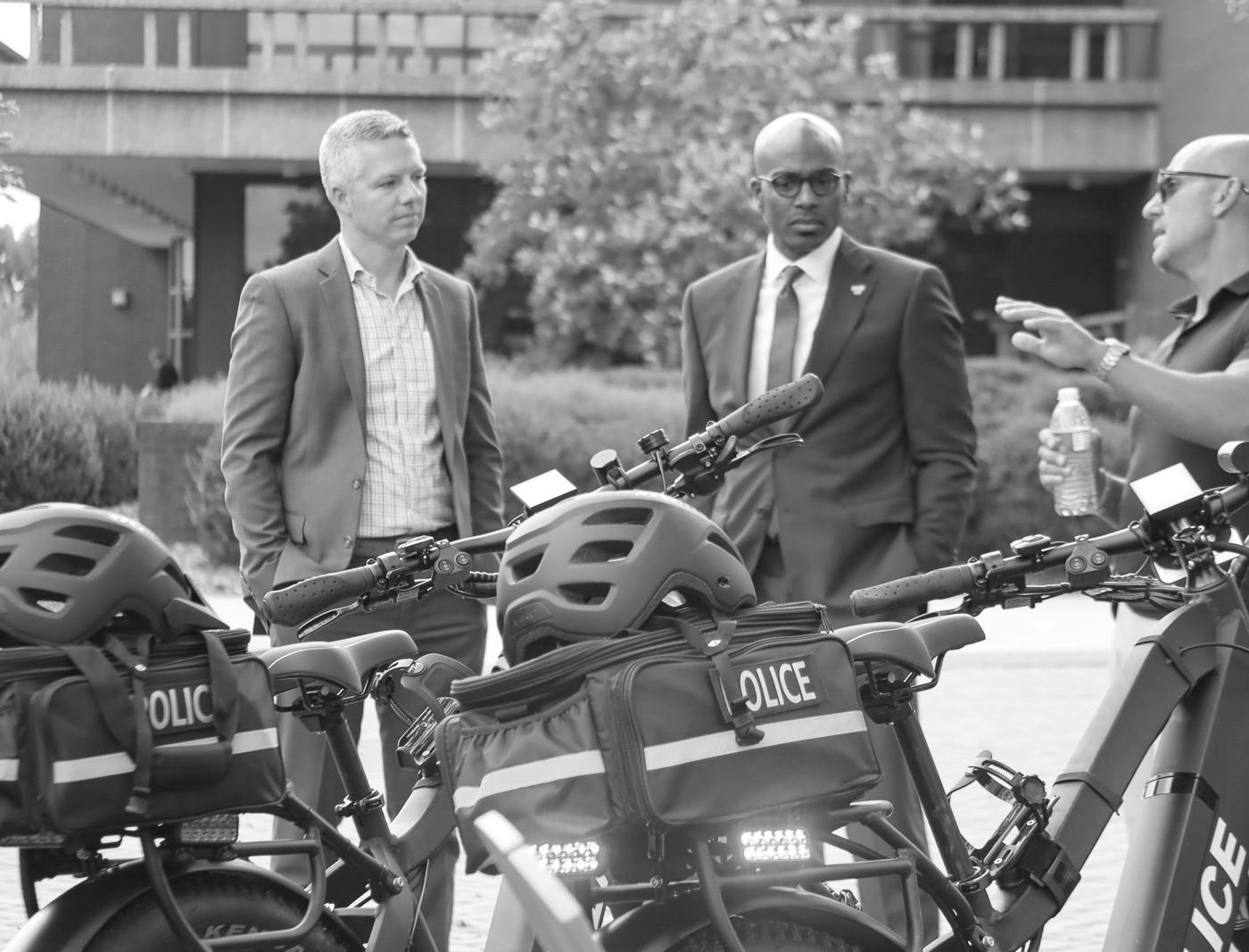 From left, MCT Managing Director Jim Morrison, Chancellor James Minor and SIUE Interim Police Captain Justin Lieberman talk about the new police bikes on campus. | Udit Nalukala / The Alestle