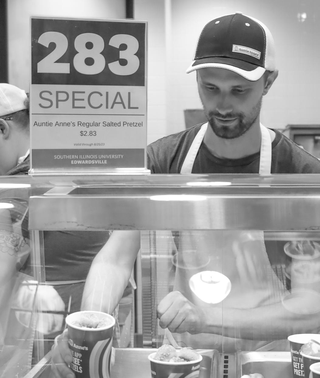 Taylor Mudge, a civil services worker, fills an order for cinnamon pretzel bites beneath a “283 special” sign, which many food service places around campus have adopted as part of university administration’s student retention campaign.