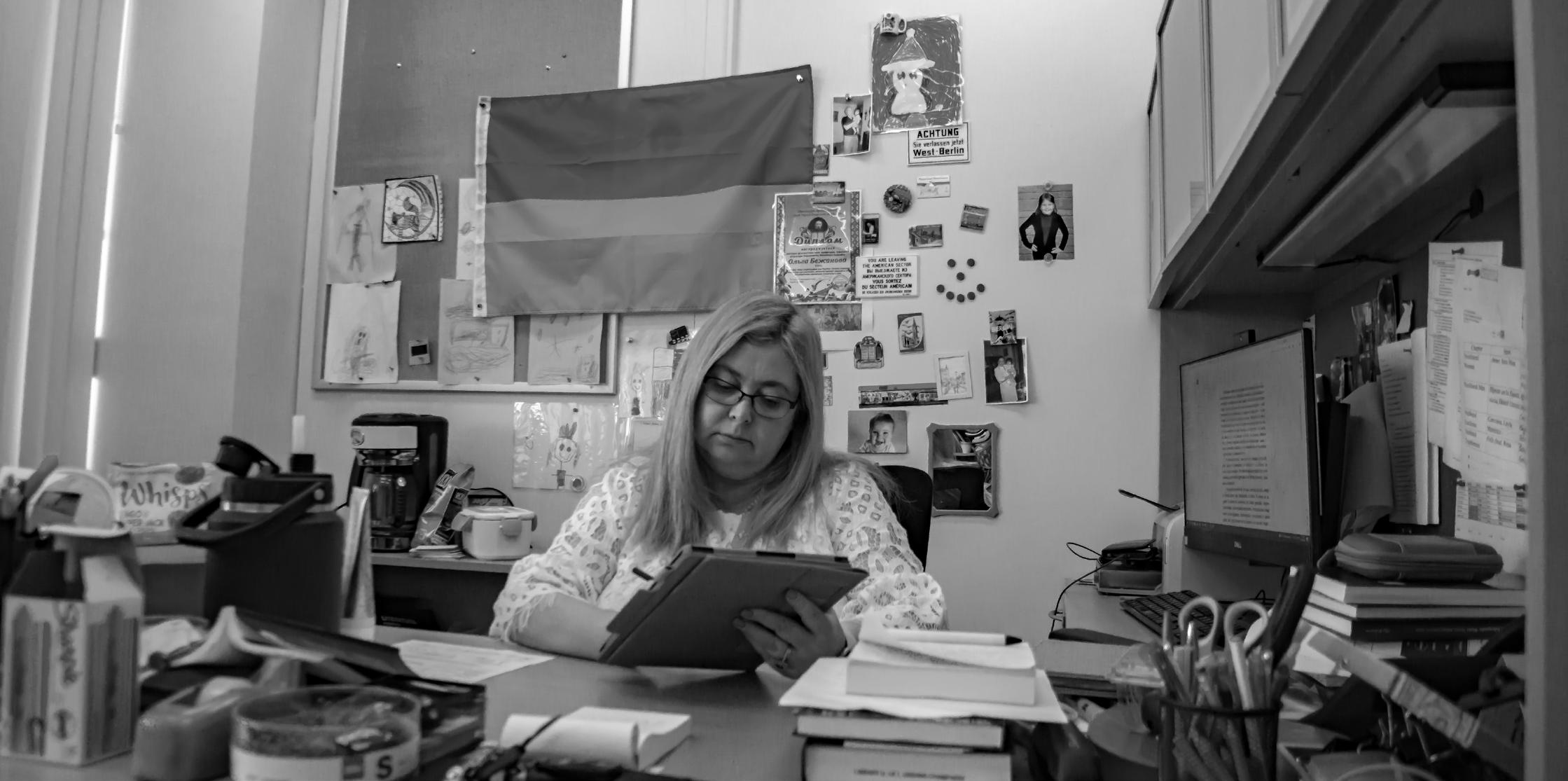 Olga Bezhanova at her desk surrounded by photos, drawings and the Ukrainian fag.