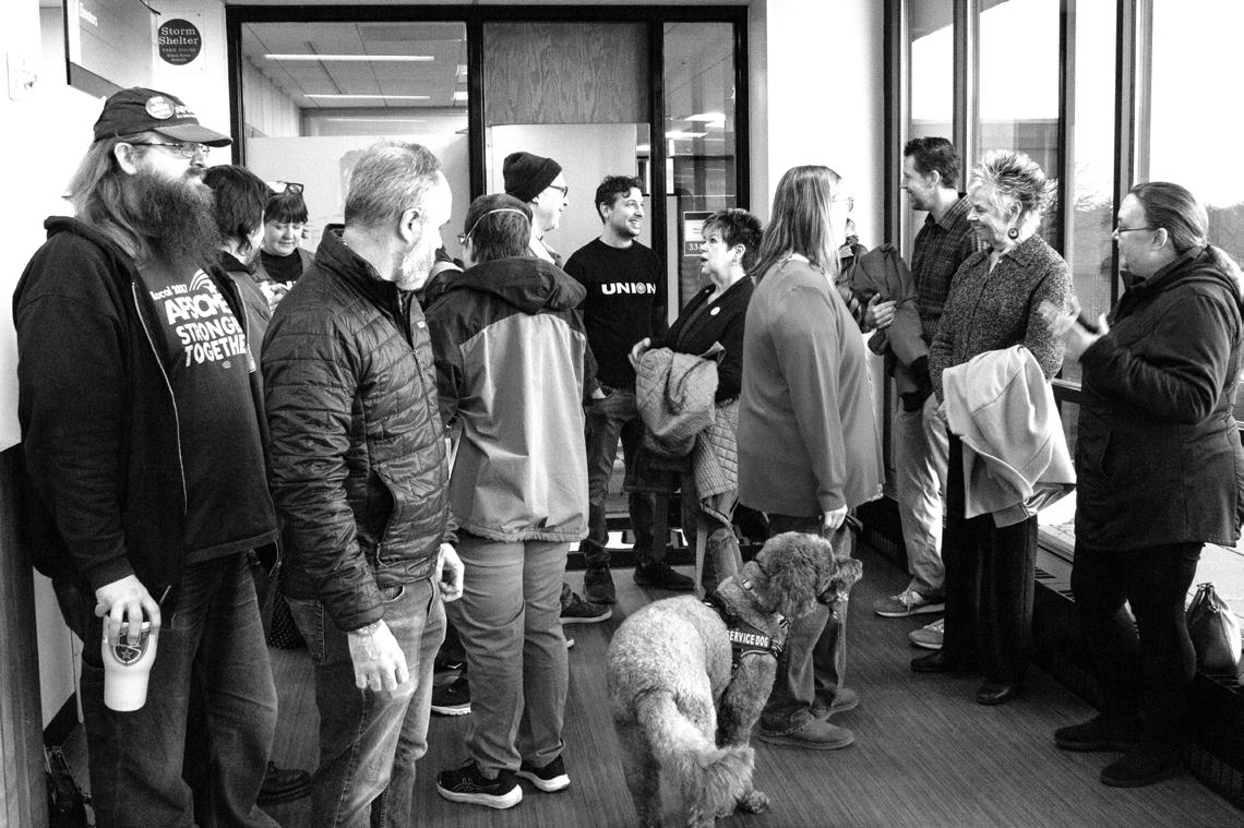 Members of AFSCME Local 2887, which represents office support specialists among other campus employees, gathered in solidarity with the Faculty Association to protest staff shortages and increased workloads.