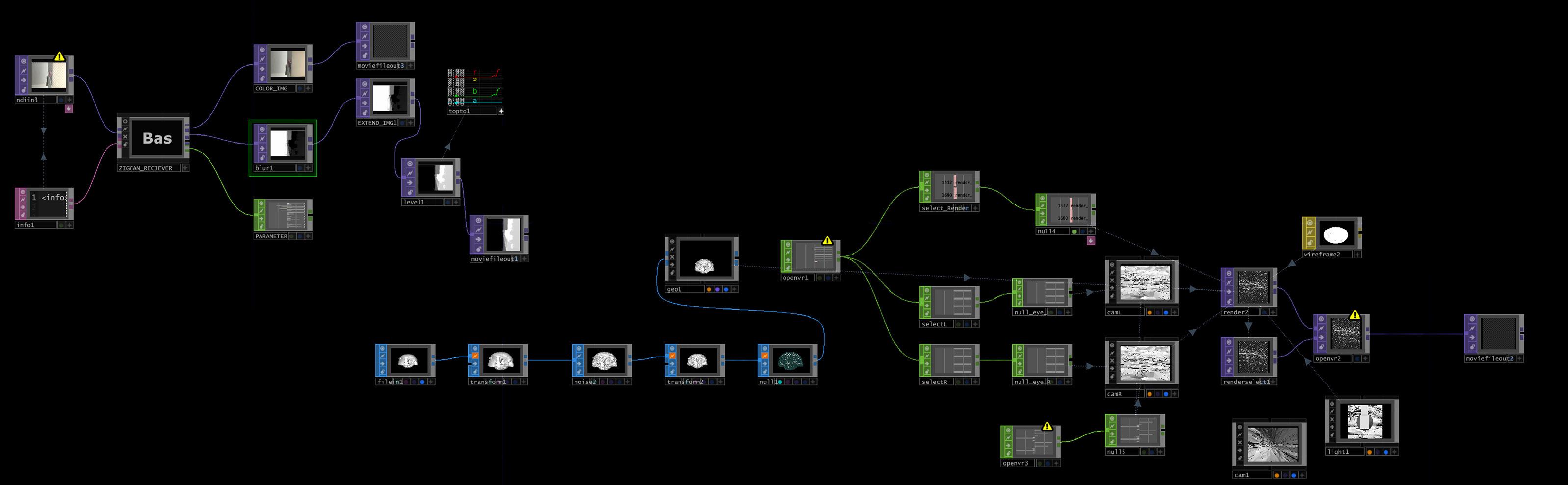 From here noise was added to the model, allowing it to randomly distort and abstract itself. In order to reinforce the importance of depth, which ultimately the defined the design dialogue through the Pix2Pix model, the distortion was instead defined by a live depth map. This was achieved through connecting the live depth map footage from my iPad to touchdesigner. From here the depth map was continuously read by the programme and the black, white values were extracted. These were then used to alter the magnitude and frequency of the model's distortion. In this way, as the space is moved through and experienced, it will continuously shift and abstract itself, based on the viewers own movement.