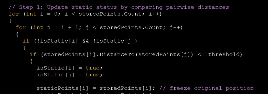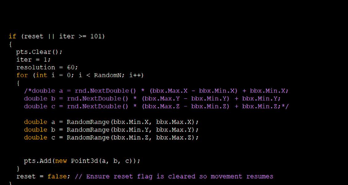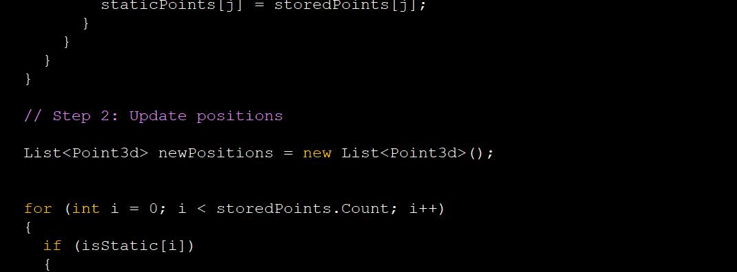 After this a new list of all the read points is created. Then if the point was previously declared static, shown by 'if (isStatic[i])', it is retained and is not randomly distributed. Otherwise the same random distribution from the initial generation framework is applied.