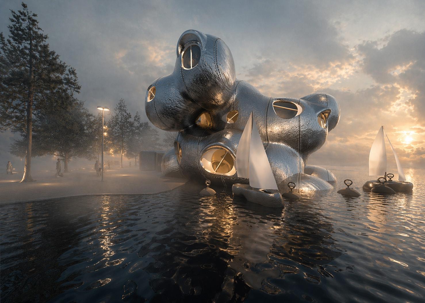 These modular spaces combine to create a fluid organic form that juxtaposes the artificial, mechanical based nature of the program itself. In doing so this contrast reflects the nature of the site itself, which is split between land and water. This connection is furthered by the form's fluidity which mirrors the shoreline, creating a balance between the natural and artificial. The project embodies the notion of evolution, beginning underwater before growing and adapting upwards into the sky. In doing so each level represents a key period of AI’s timeline with underwater spaces chronicling AI’s early history and ground level spaces representing the unfolding present. Above ground, the elevated modules represent the speculative future of AI, designed to grow and evolve over time, creating new levels as AI advances. These levels will be designed through a generative process, using AI to evaluate built form. This allows the spaces to become a physical manifestation of AI’s timeline that will grow and evolve alongside it.