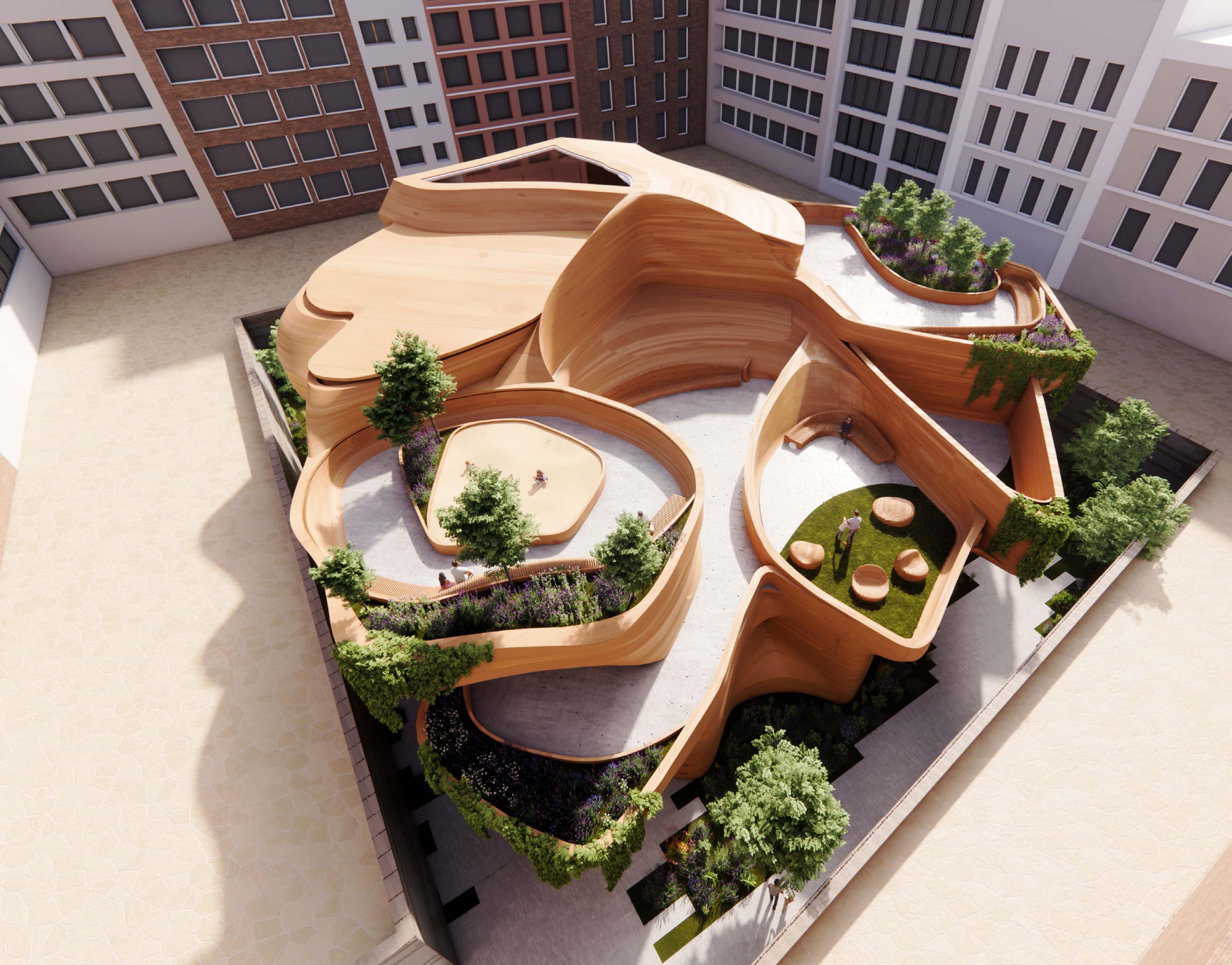 This project served as my final design for my second year at the Bartlett, as part of UG21. Located on the “Aguas Park”, in the sequentially created Eixample district of Barcelona, this project proposes a novel approach to a community centre, in which the programme revolves around the creation of a community centre which supports and facilitates the cohabitation and interaction of children and the elderly. By utilizing a series of modular spaces, the proposal seeks to facilitate a variety of intergenerational events, which in turn will nurture and provide support to both age groups. In this way the building serves as a blank canvas to be painted and coloured through the interaction of different lifestyles and experiences. Furthermore, the building itself proposes a new approach to design, with it being intended to be constructed from a series of stacked wooden contours that would be cut and formed utilizing drones.