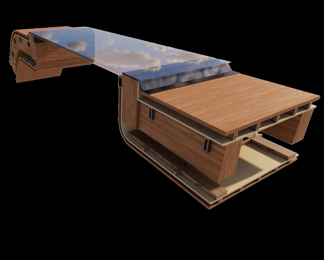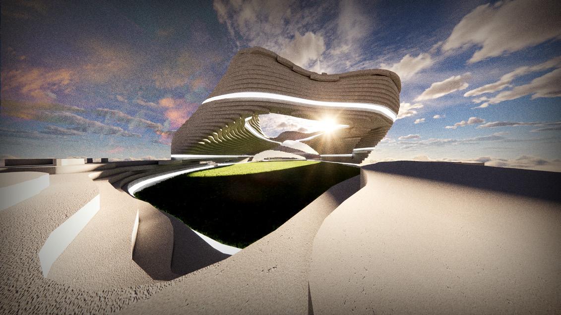 The rounded and multi-leveled surfaces of the design are promising for effective rainwater management. They seem to facilitate the collection and possibly the redirection of rainwater towards designated storage or drainage systems. This could be exceptionally beneficial in managing the high annual precipitation of 1043mm. Nonetheless, the actual detailing of gutter systems, drain placements, and water handling efficiency cannot be derived from the model alone, which means the theoretical advantage might not fully translate into practical efficiency without additional infrastructure.