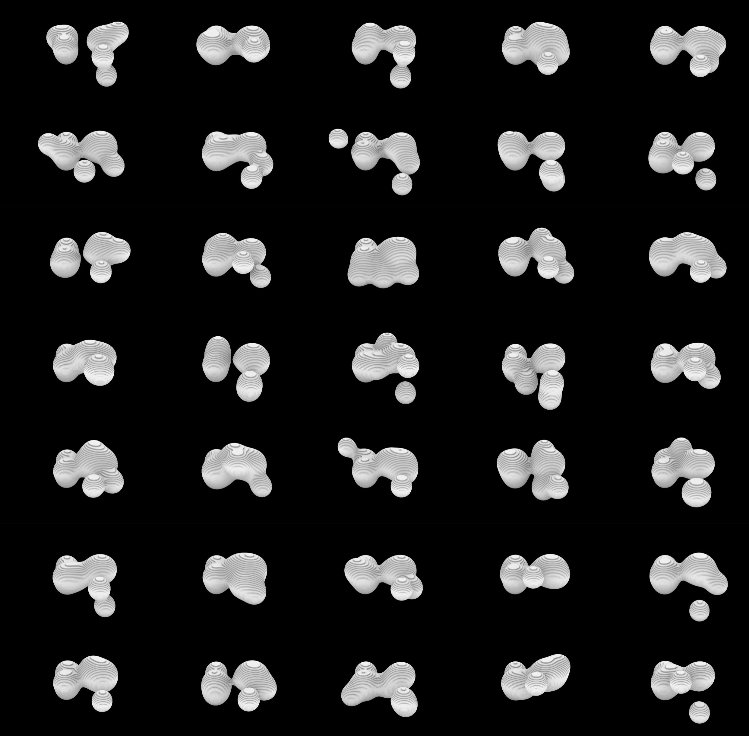 In order for the evaluations to directly affect the next iteration of generations, a second version of the generation framework was created. This variation first checks the distance of each of the points of the preferred generation. Through this, points that are in close proximity to others are kept static meaning that they are altered within the iterations, mainting a solid core to the generated forms. This distance is modified by a threshold variable, which provides opportunity for the code to find nearby points. After this, the same process as earlier is applied, with the form being generated and an image and list of points being saved