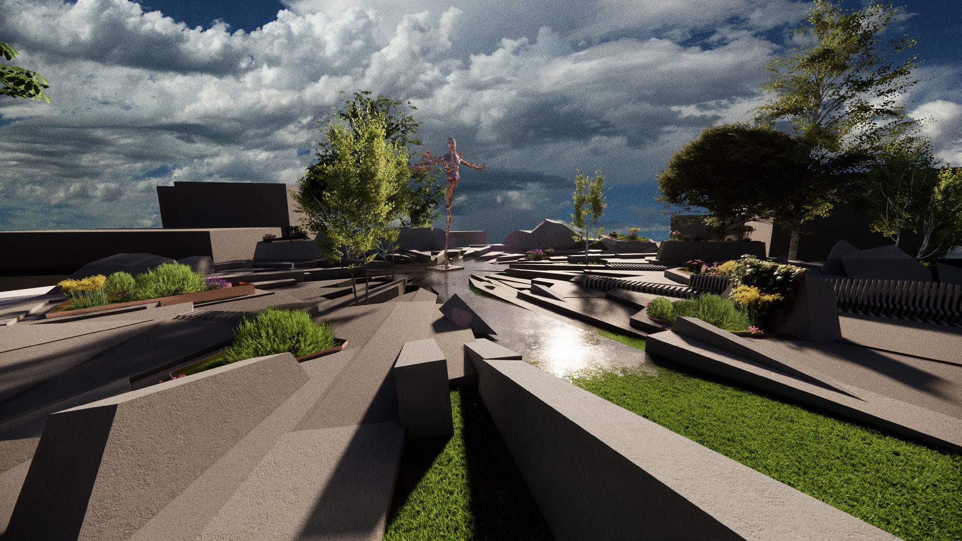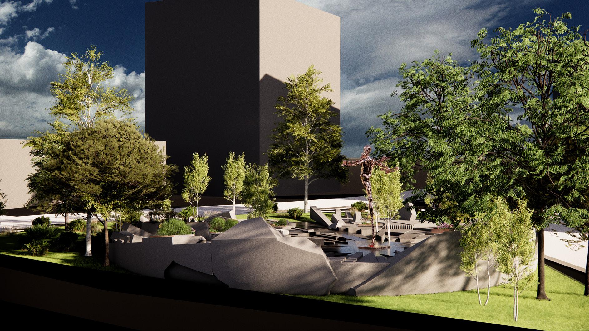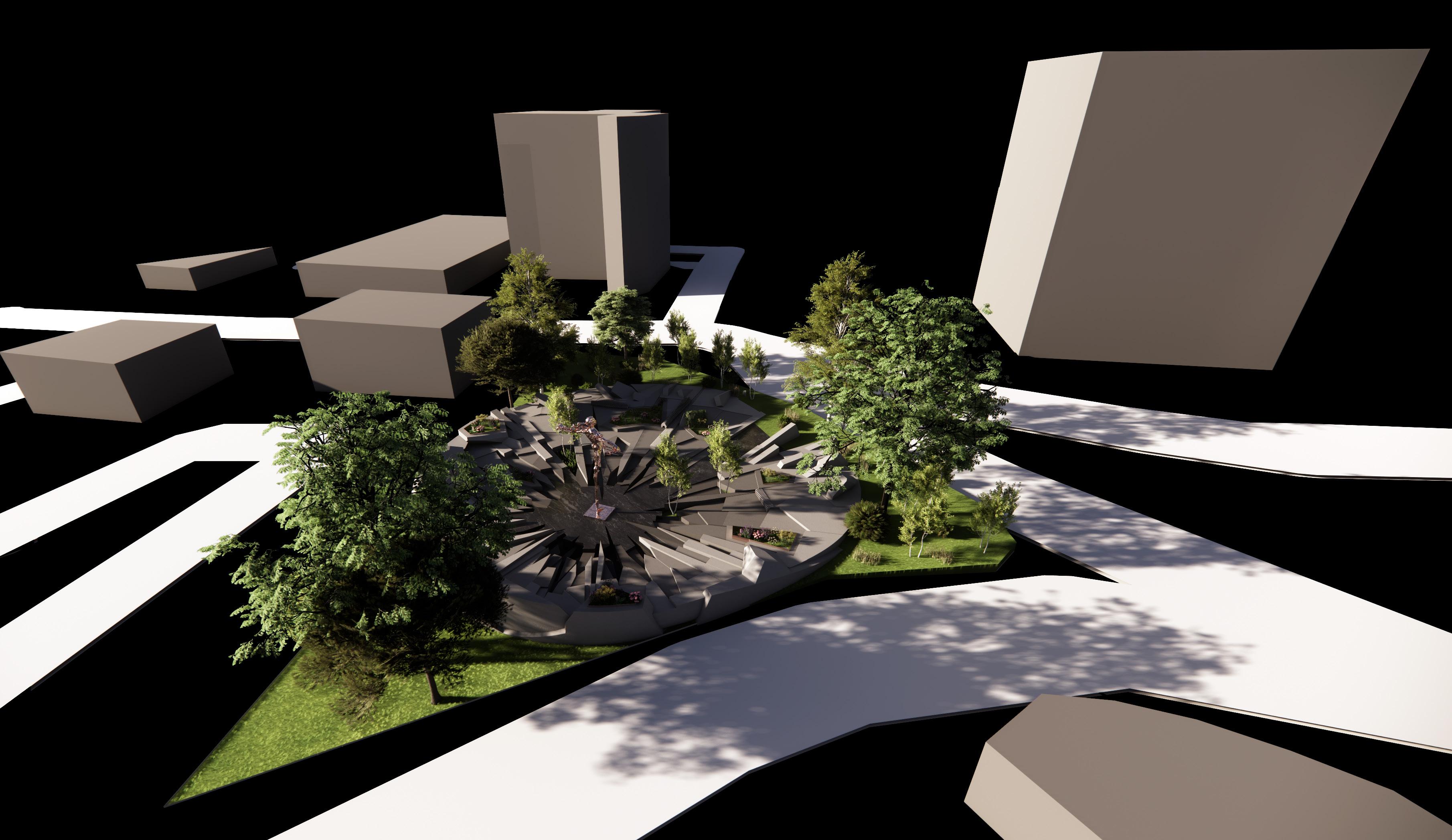 The memorial is composed of 150 shards arranged in a circular field, shifting through a gradient of six grey tones. The shards grow darker as they move toward the center, where the aformentioned sculpture will stand. As the grey tones darken toward the center, the memorial guides visitors into a deeper, heavier atmosphere. The shift in color mirrors the emotional descent into the core of the tragedy, preparing the viewer for the sculpture that represents the genocide itself.