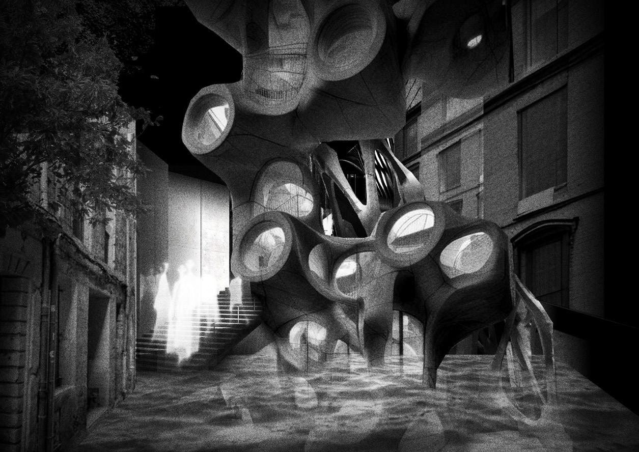 In order to allow the building to grow and evolve alongside AI a generative evolution process was created, where architectural forms were created and evaluated through an iterative process. First a program was created that can randomly distribute points within an area. These points then serve as a basis for three dimensional massing models, that are then analysed through ChatGPT which will score each mass based on a set of parameters. The parameters used fall into three core categories, namely design based, experiential, and contextual. First the forms were rated based on their appearance, with ChatGPT developing a personality based on previous work within the Bartlett, before then being analysed based on the marking criteria of the design module. After this the AI was asked to analyse experiential parameters, namely its relevance to the building's program as well as the human experience. Lastly the system evaluated the forms based on contextual parameters, reviewing the forms relationship with the site itself and analyzing them based on the environmental conditions of Lyon.