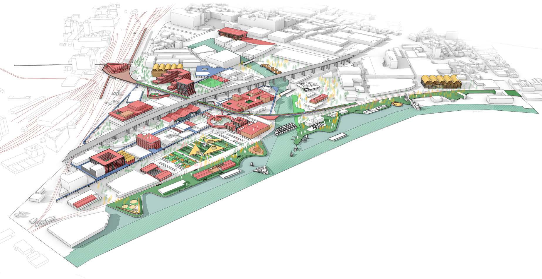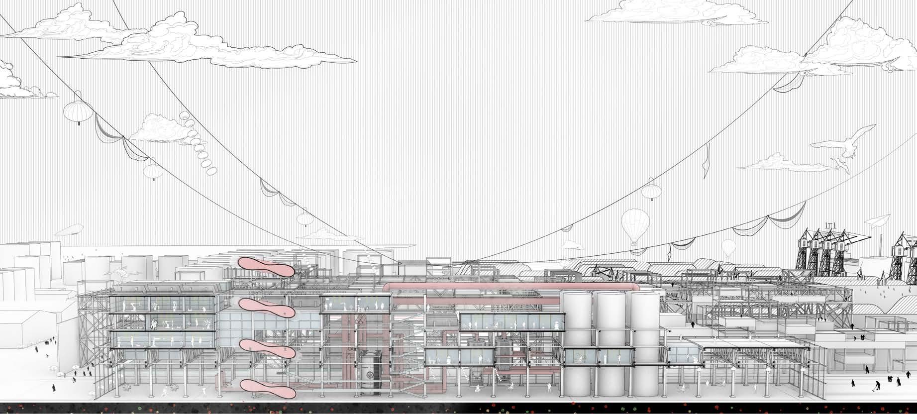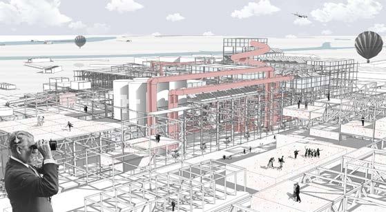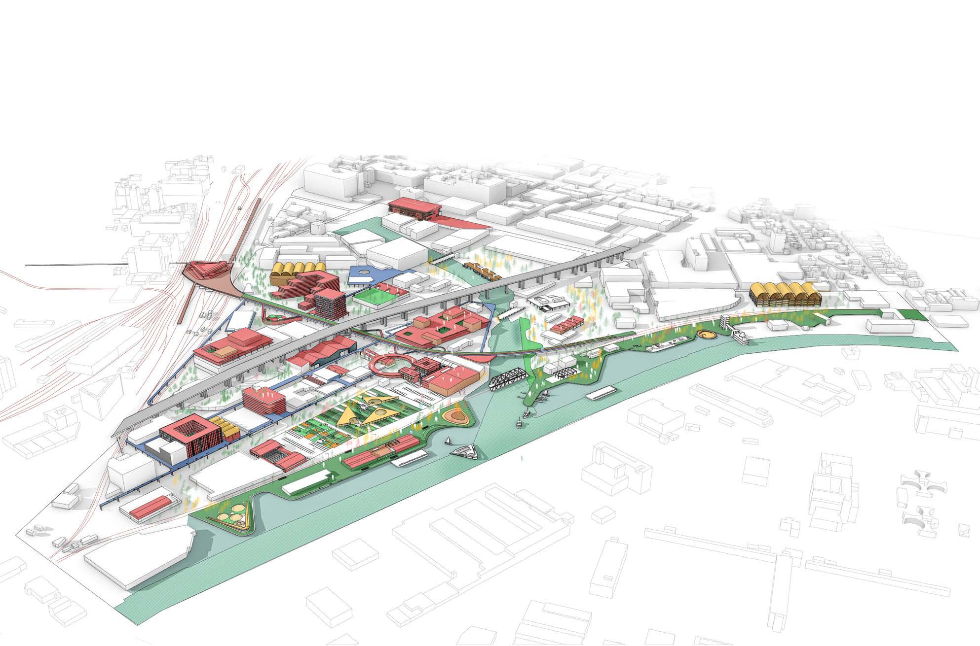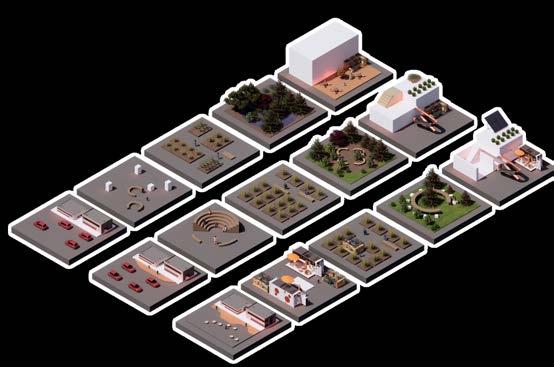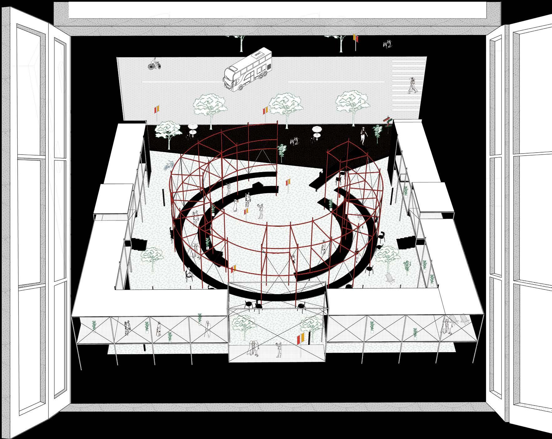 The infrastructure is designed to be flexible and adaptable, accommodating different activities, from hosting a market to serving as seating areas. Design of the infrastructure relies on fundamental components that can be adjusted and reconfigured based on the site's constraints.