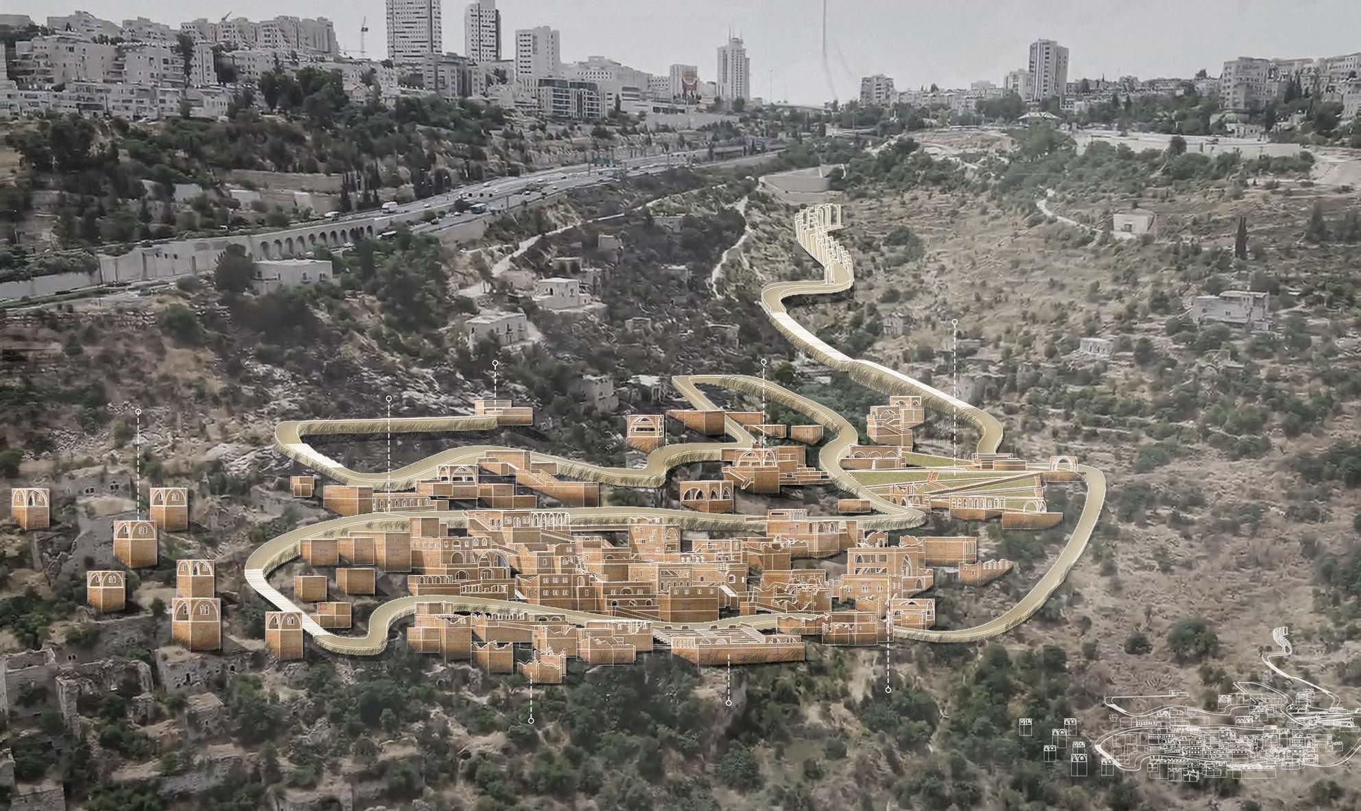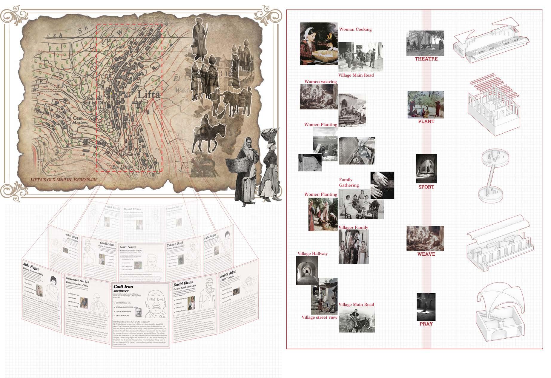 This project translates into architectural forms through the extraction of Individual memories and Collective memories of indigenous peoples in the diaspora. And through the technique of architectural narrative, each theme group is organized to recreate the village in the memory of the lifta villagers. The aim is to create an open, free, outdoor museum where there are no more territorial disputes, and at the same time remind everyone of the cruelty of war.