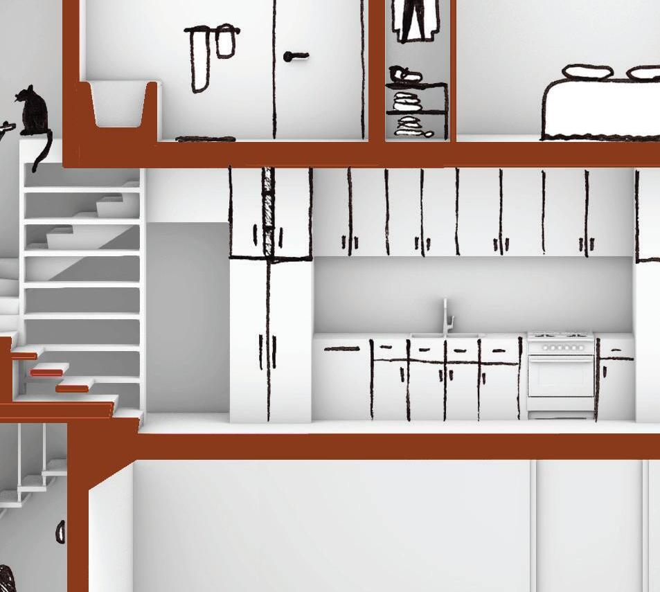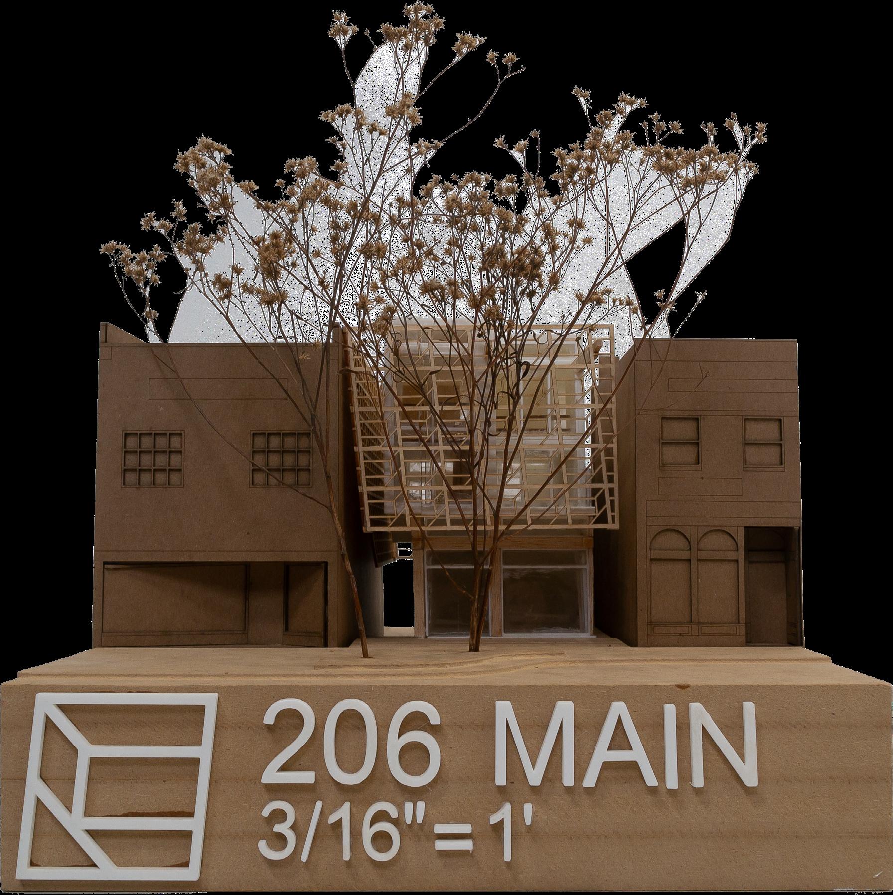 206 Main Street is the address of an infill dwelling to be located in Ames, Iowa’s historic downtown. The program for this assignment was to fit two small apartments above a commercial “flex” space. My design accomplishes multiple goals. First, every room in the building has direct sunlight. Sawtooth windows, a prominent feature of the design, let in soft northern light. Second, each of the apartments has privacy from one another. They have seperate entrance stairs and offset patios, but the plan for the building still follows a cohesive grid.