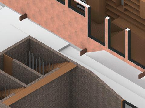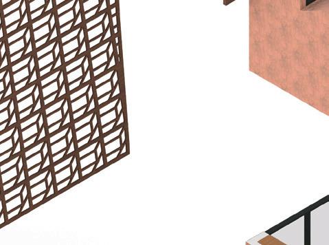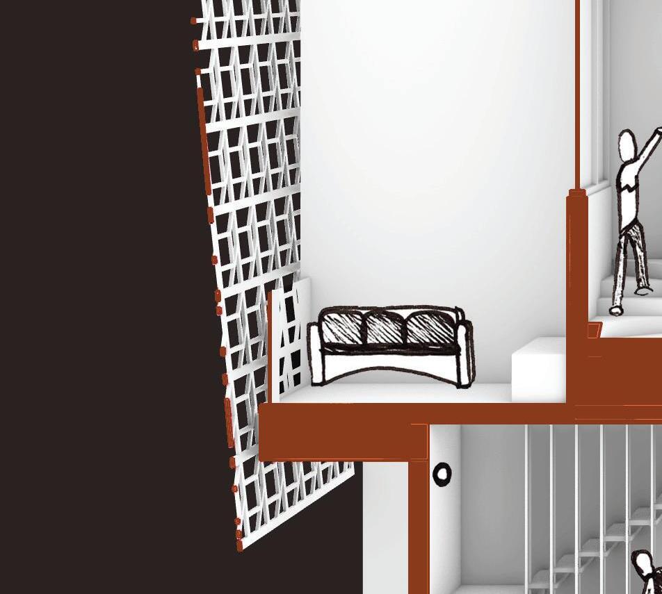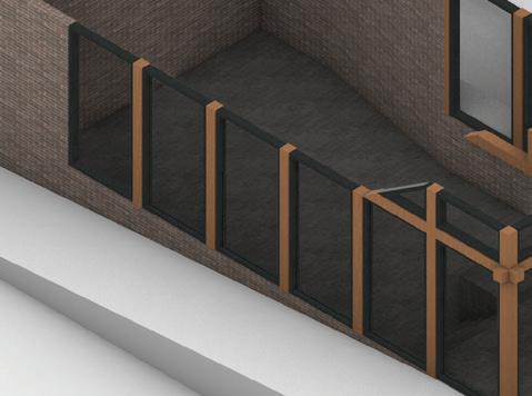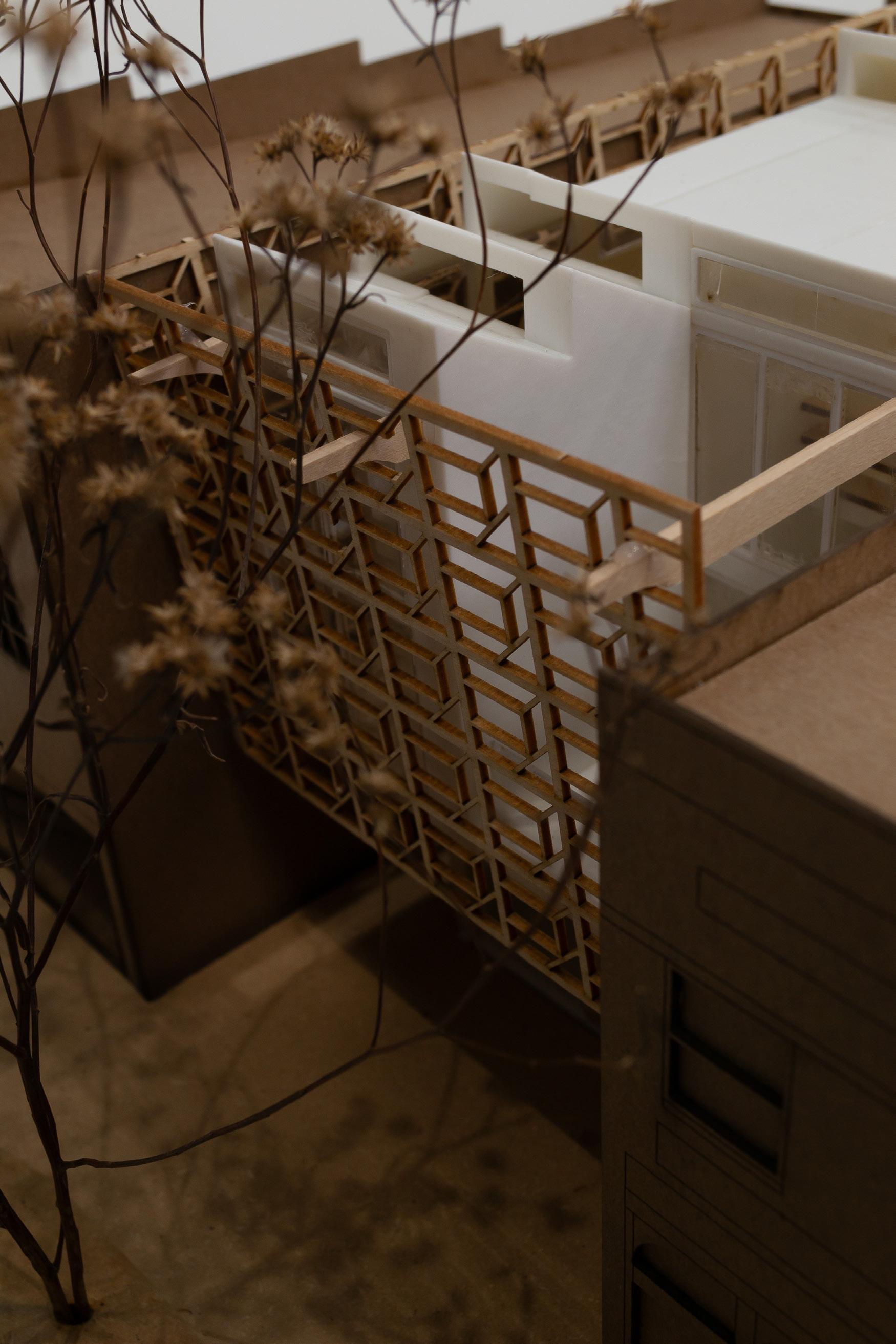 Finally, the defining feature of the exterior facade is the wooden screen. This screen, inspired by a previous school project, casts shadows into the space; creating an everchanging and immersive interior.