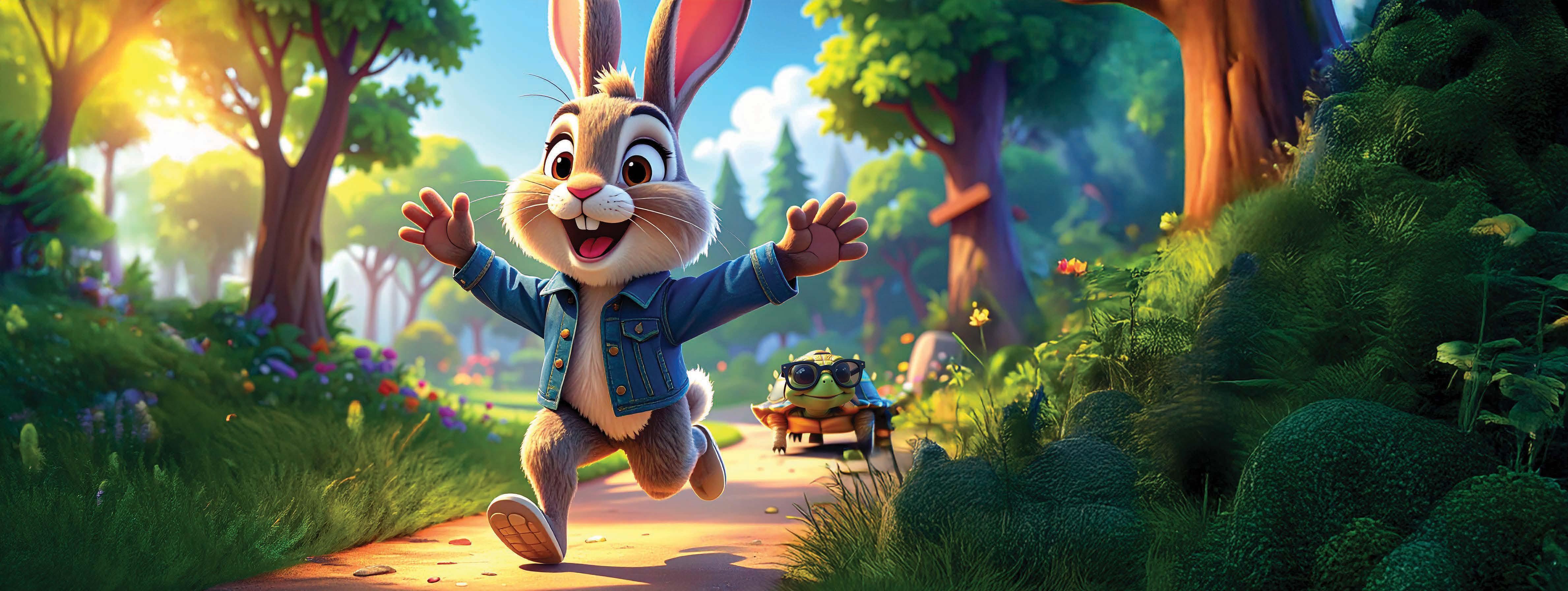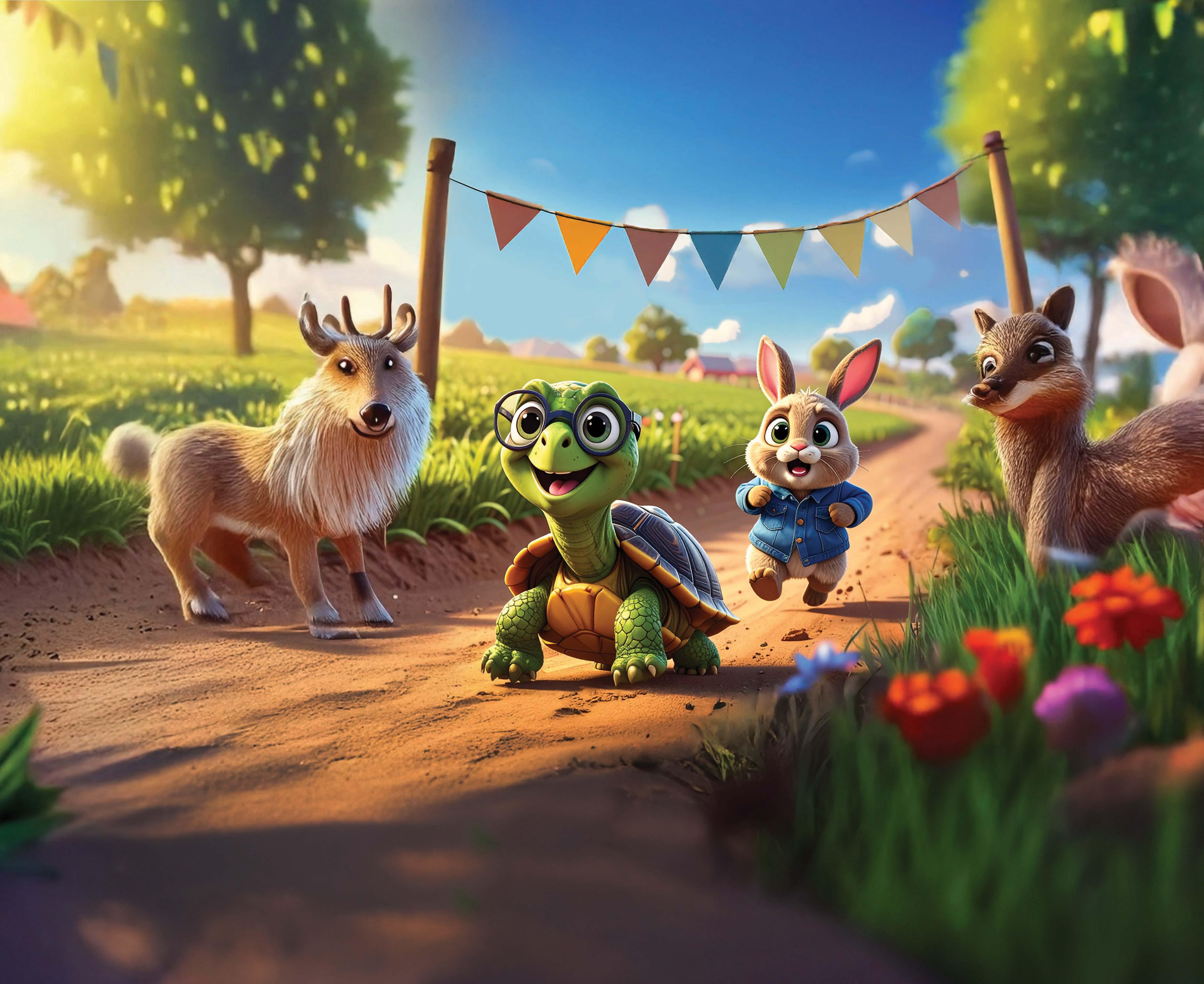 "Let's see who is the fastest", Harry the hare says to Tommy the tortoise... "I'll race you to the finish line!"