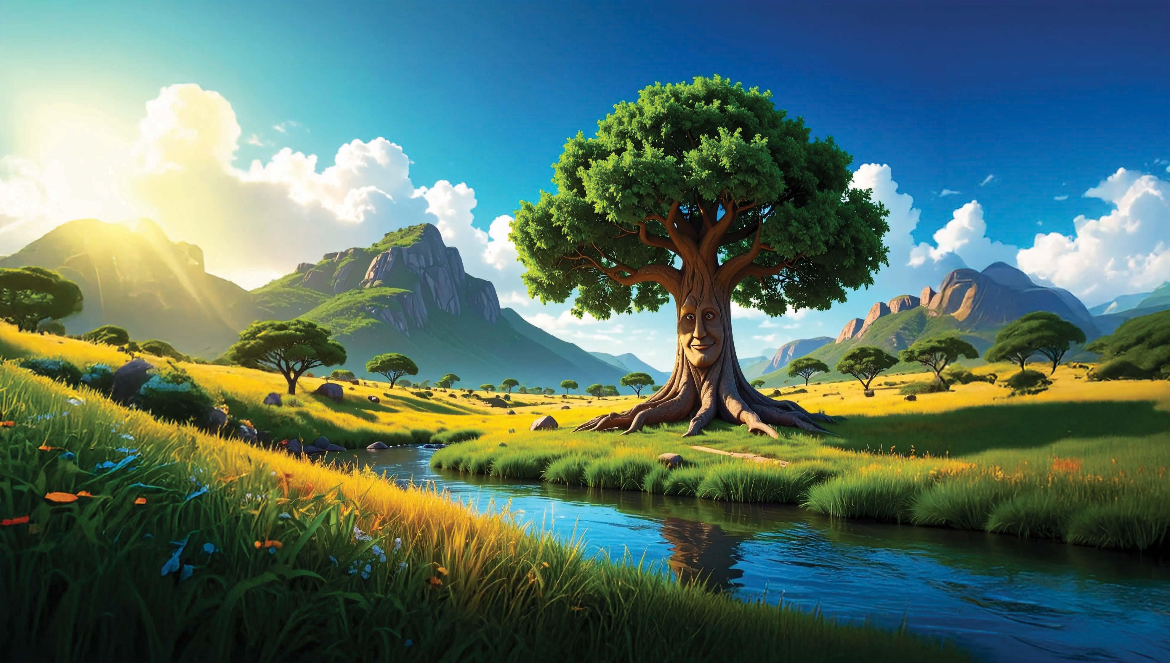 Ollie Oak stood proud, tall and wide, rooted deep by the riverside.