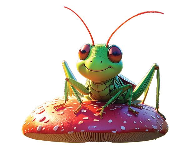 But who came hopping, with legs flying all over? Greg the grasshopper, loud as a bongo. He strummed on a leaf and sang, “La la la!