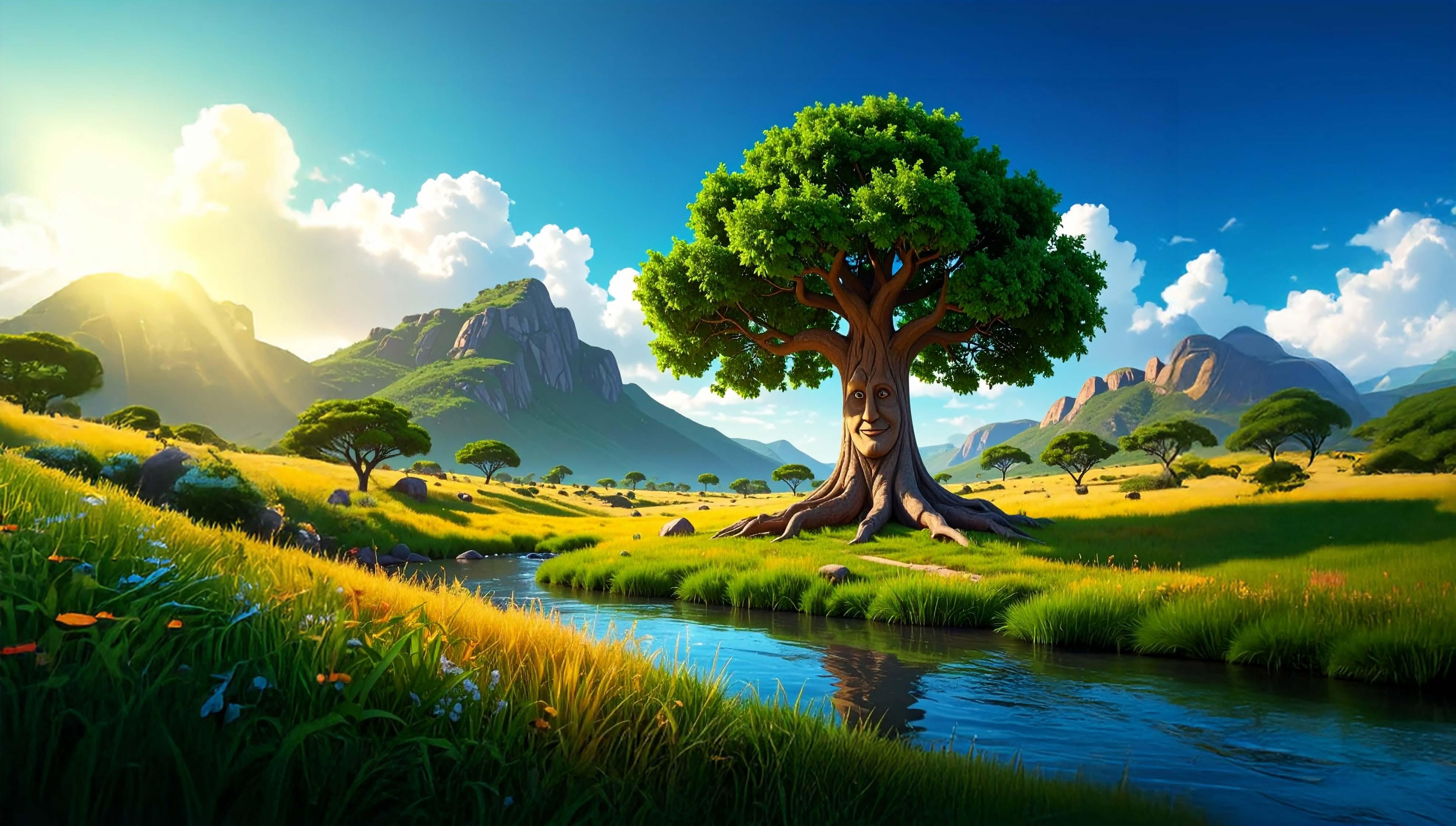 Baba Oak stood proud, tall and wide, rooted deep by the riverside.