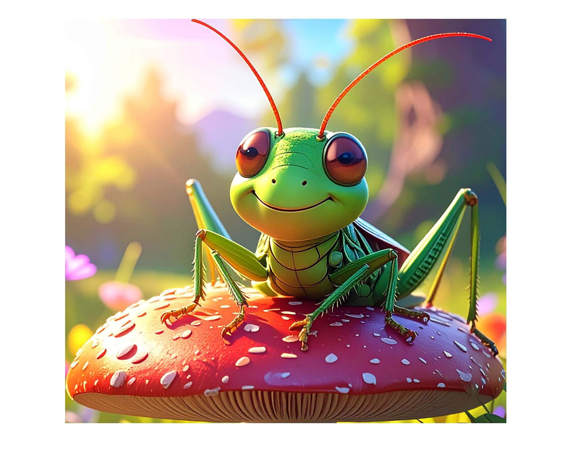 But who came hopping, with legs flying all over? Greg the grasshopper, loud as a bongo. He strummed on a leaf and sang, “La la la!