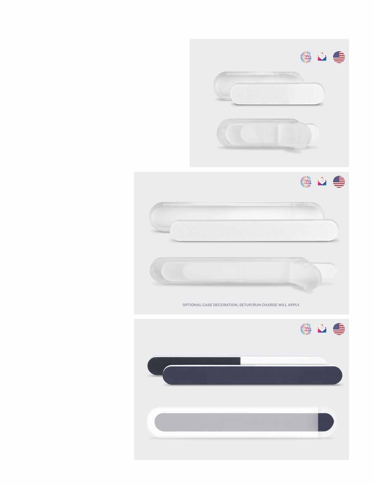Items are flat, and lightweight. They can be inserted into a direct mail envelope or held in place with adhesive. Ask us about custom backer cards for emery boards and magnifiers.