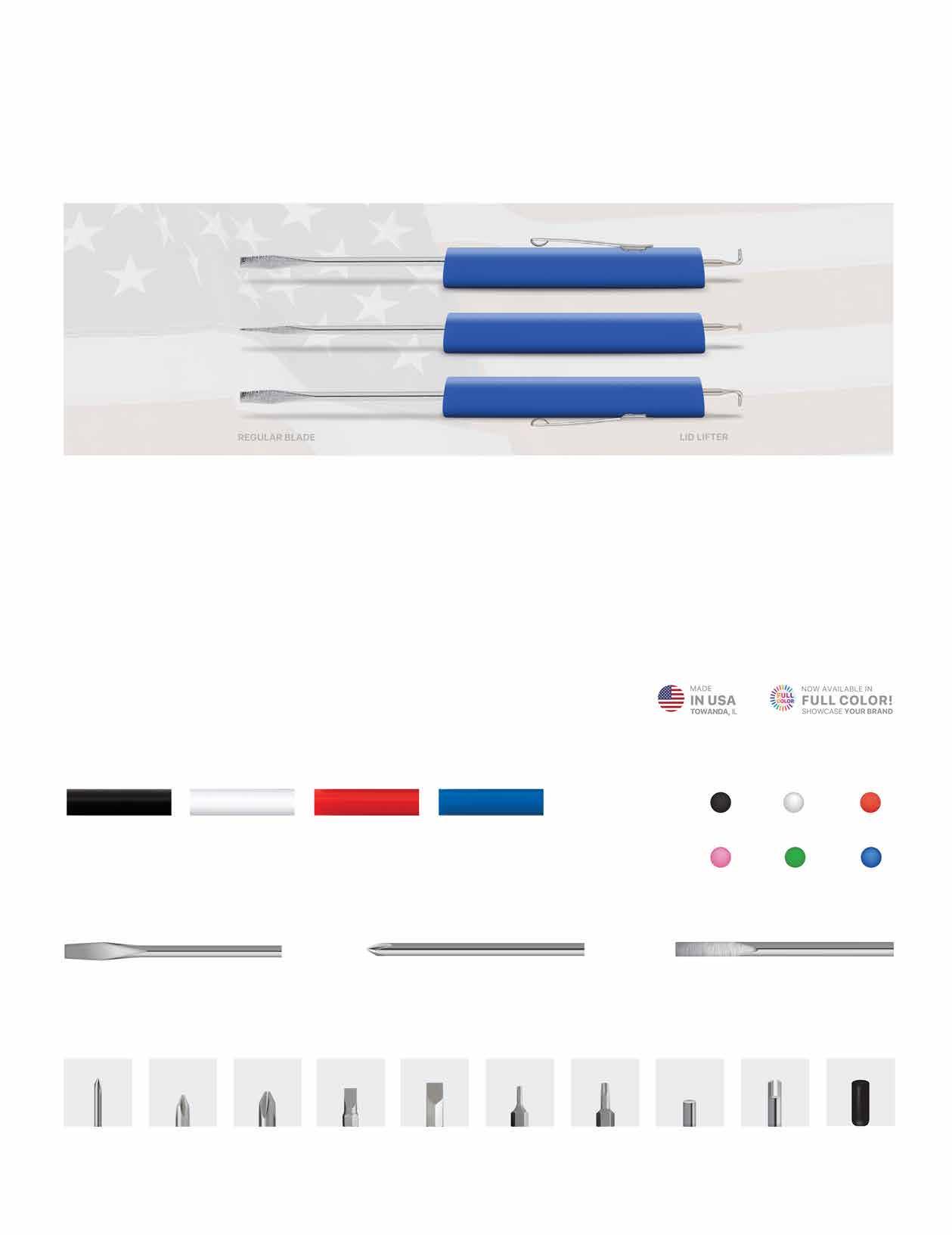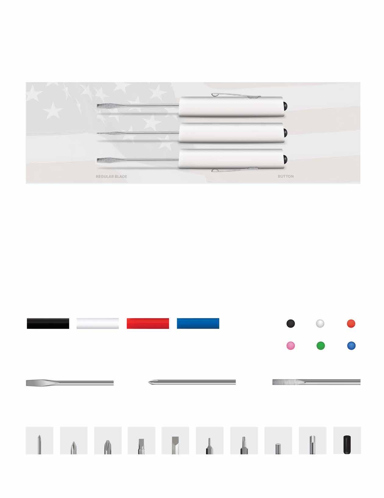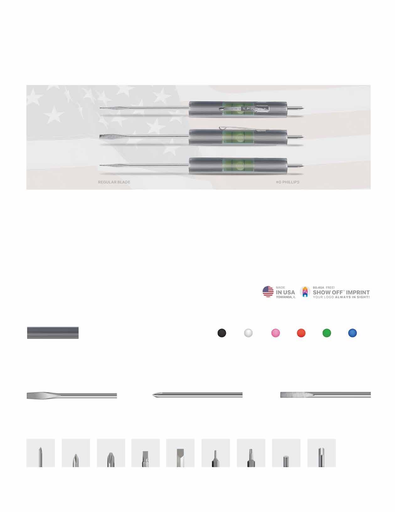 8 CATALOG 2023 | SCREWDRIVERS MIN 200 ORANGE PMS 151 YELLOW PMS 109 GREEN PMS 802 BLUE PMS 661 NAVY PMS 280 BLADES PHILLIPS SIZE 0 HEAD REGULAR BLADE .125” WIDE HEAD ELECTRICIAN .125” WIDE HEAD