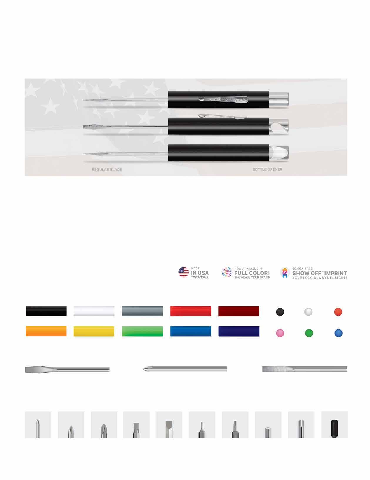 Our popular Show Off™ above-the-clip imprint is free on all printed cylindrical items. This includes pocket screwdrivers and hand tools.