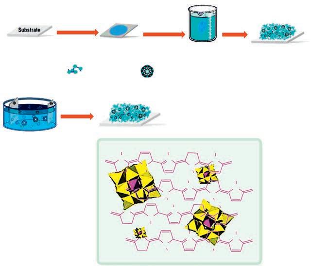 The reversible redox chemistry and conductivity exhibited by conductive organic polymers (COPs) in combination with their relatively low cost and good handling capacity have rendered these materials excellent substrates for polyoxometalate integration with polyoxometalate. Various conductive organic polymers can be utilized to afford hybrid materials with polyoxometalates among which polypyrrole (PPy) [145–148], polyaniline (PANI) [149,150], polythiophene (PT) [151], and their derivatives are the most common. As illustrated in Fig. 1.8, the procedures for immobilizing polyoxometalates within a COP matrix are categorized into two broad groups. In the first type, after following a two-step approach, a polymer thin layer is deposited on a substrate through electro-polymerization or spin coating. Then the polymer film is dipped in a polyoxometalate solution so that the polyoxometalate is diffused and incorporated into the polymer matrix [145]. In the second type, which is a onestep method, a monomer molecule is chemically or electrochemically oxidized to form a polymer thin layer in the presence of a polyoxometalate solution. High ionic conductivity, strong oxidizing power, and acidic character of heteropoly acids deliver the best conditions for the polymerization of such monomers as thiophene, aniline, and pyrrole. In the electrochemical polymerization of a monomer, the polyoxometalate solution is frequently utilized as the electrolyte. A thin layer of polymer is deposited on the working electrode by applying a sufficient oxidation potential, which is doped with the polyoxometalate molecule. Polymerization techniques give rise to a nanostructured hybrid species in which the bulky polyoxometalate molecule is confined within a COP matrix [149,150]. The abovementioned approaches can be adapted to prepare a wide range of new POM-COP hybrids.