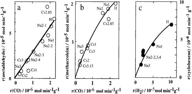FIG. 1.7 Correlations observed among the catalytic activity and oxidizing ability for the oxidation reactions of (A) acetaldehyde, (B) methacrolein (surface reactions), and (C) oxidative dehydrogenation of cyclohexene (bulk-type II reactions). r(acetaldehyde), r(methacrolein), and r(cyclohexene) are the rates of catalytic oxidations of acetaldehyde, methacrolein, and oxidative dehydrogenation of cyclohexene. r(CO) is the rate of reduction of the catalysts by CO; r(H2), reduction rate of catalysts by hydrogen. Mx denotes MxH3 xPMo12O40. Na2-1, -2, -3, and -4 are Na2HPMo12O40 of different lots, for which surface areas are 2.8, 2.2, 1.7, and 1.2 m 2 g 1, respectively [20].