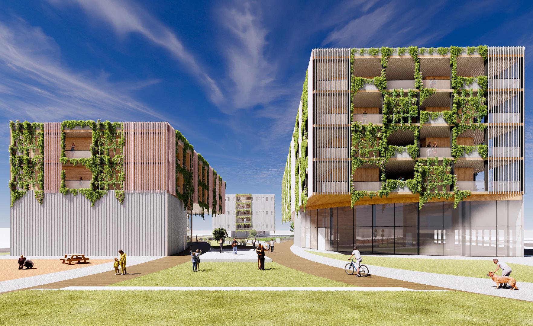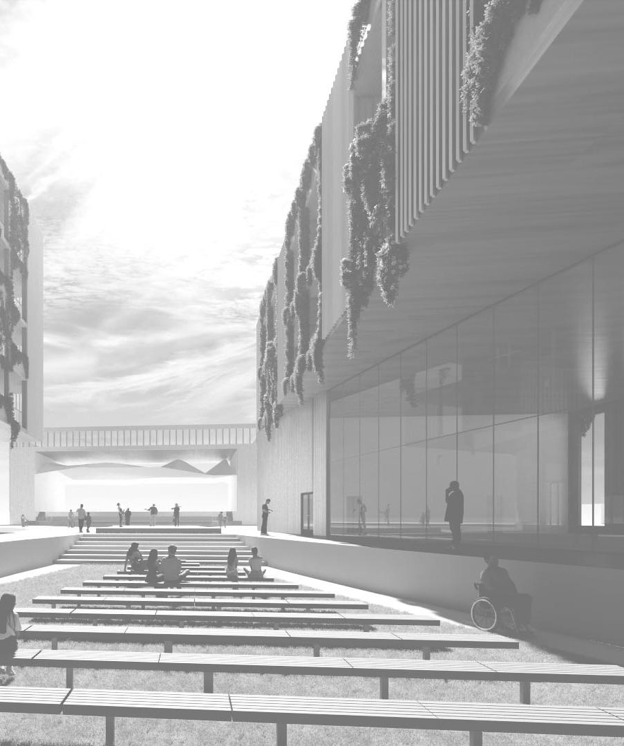 Experienced from the amphitheater, the design frames an inclusive open space for all ages. The facade and structural system reflect a sustainable ethos, aligning the architecture with long-term environmental responsibility.