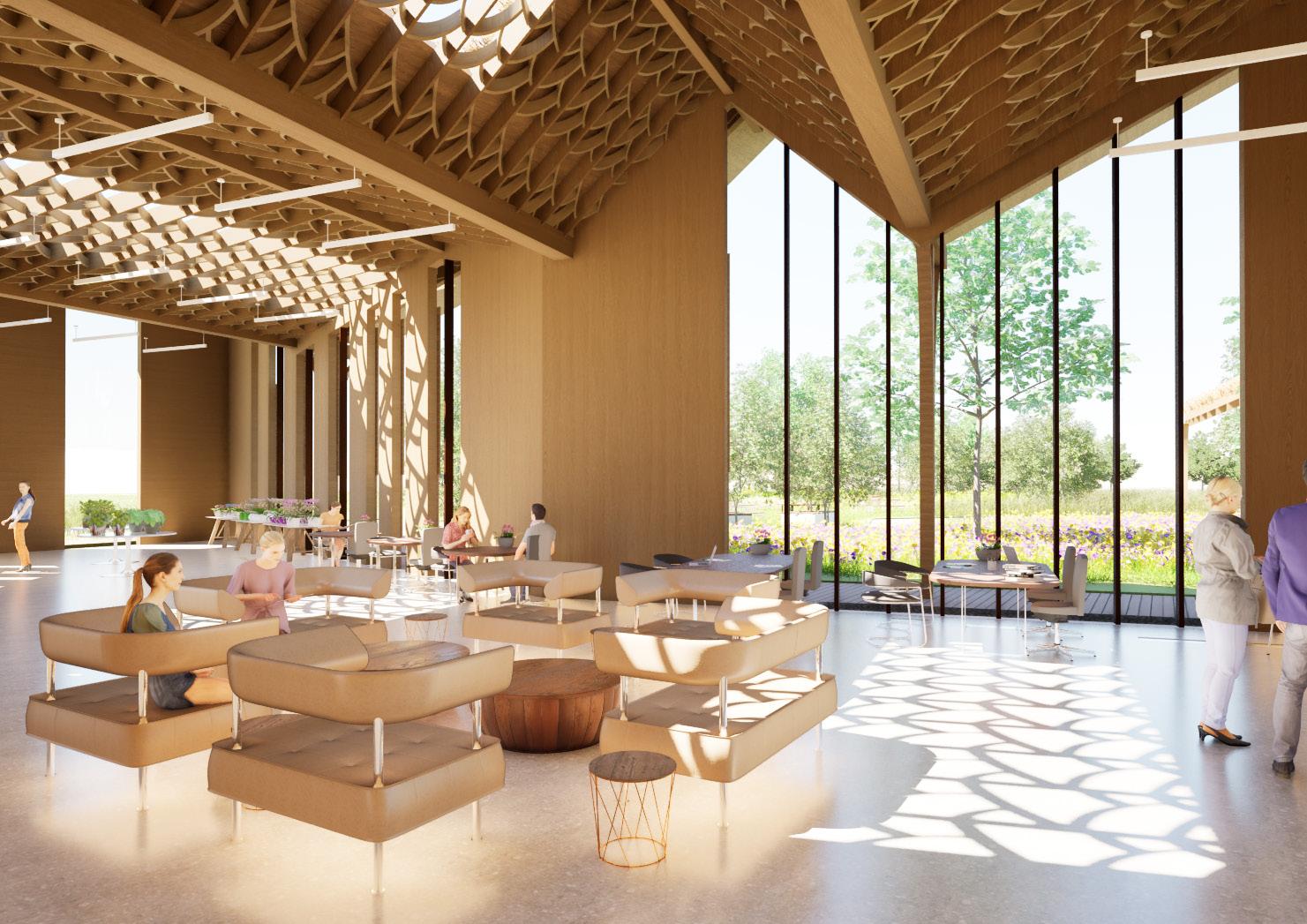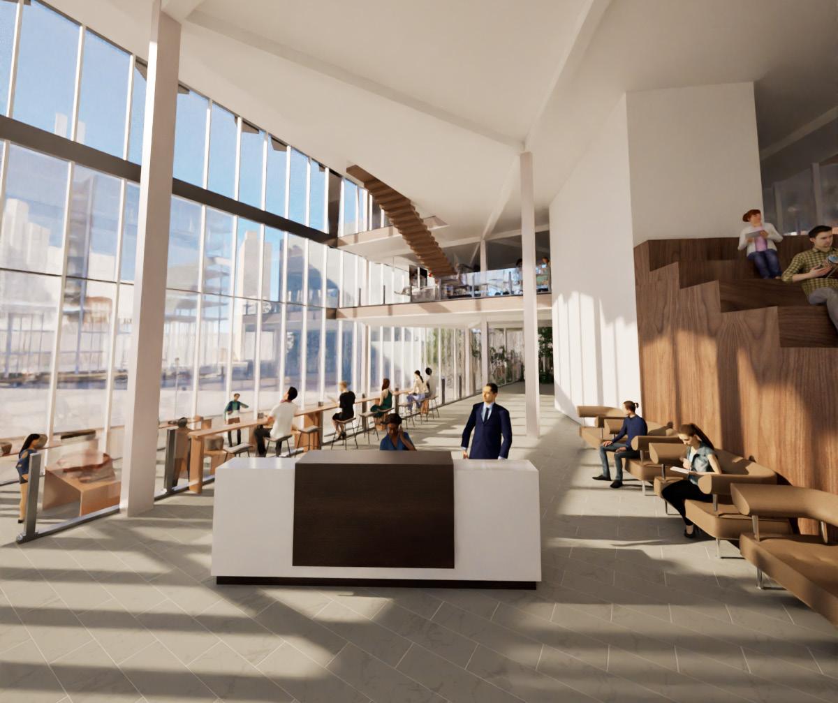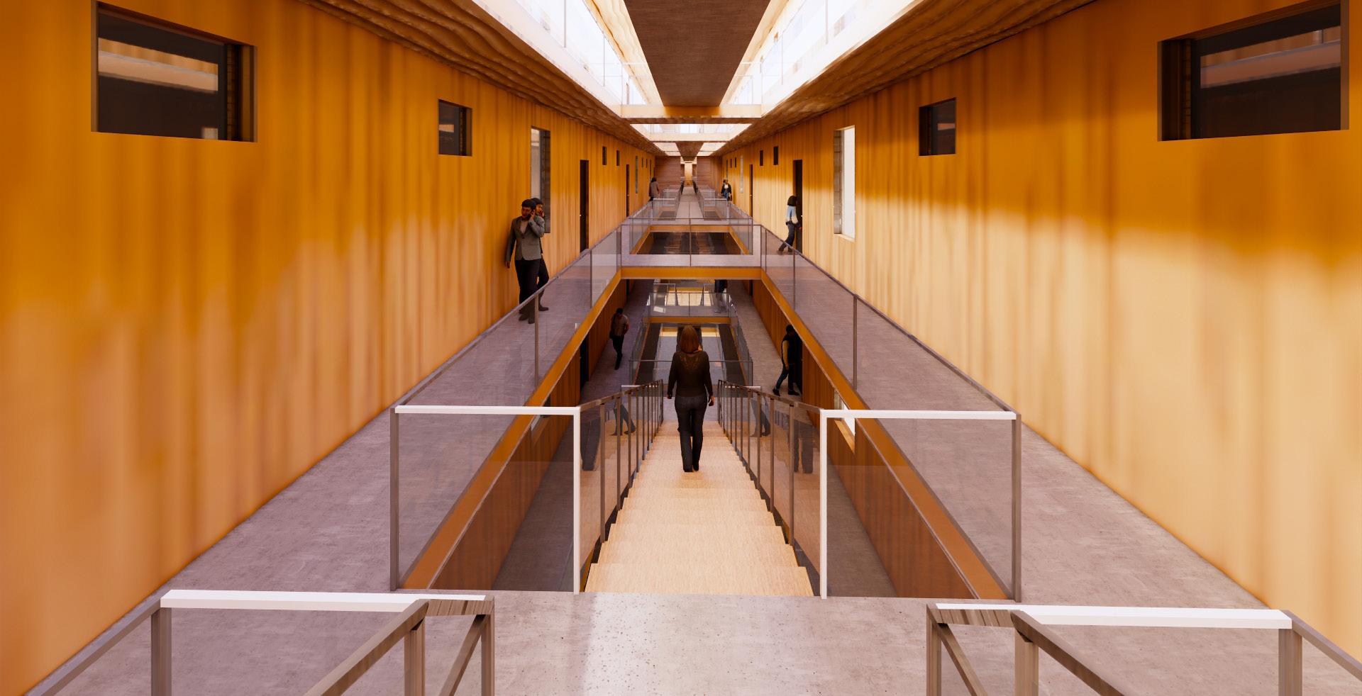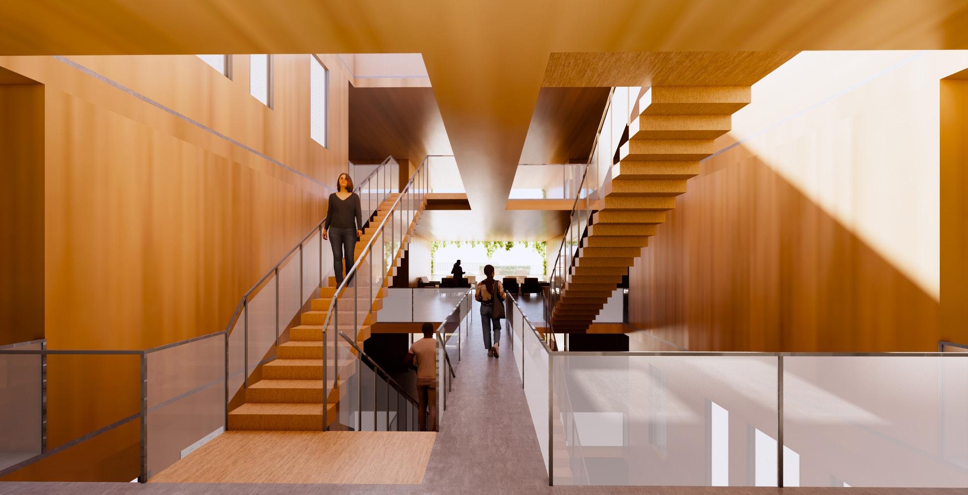 The main lobby opens as a welcoming threshold, where a learning stair and gallery space frame views outward, inviting occupants to engage with both the building and its surrounding context.