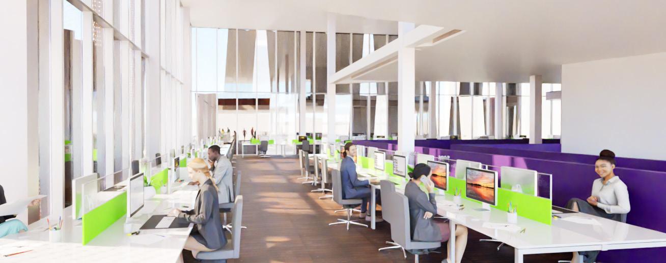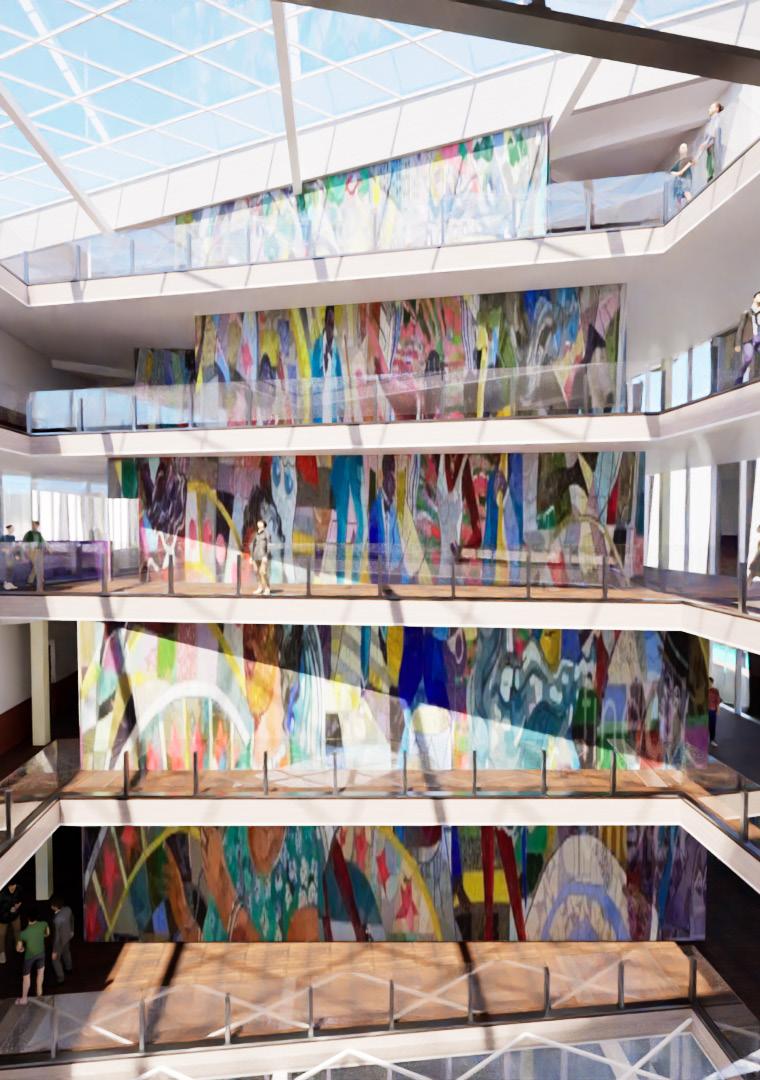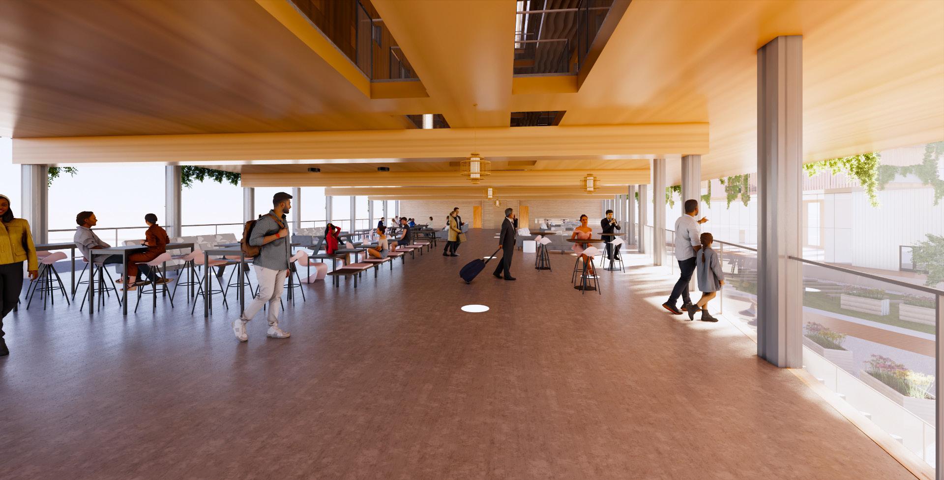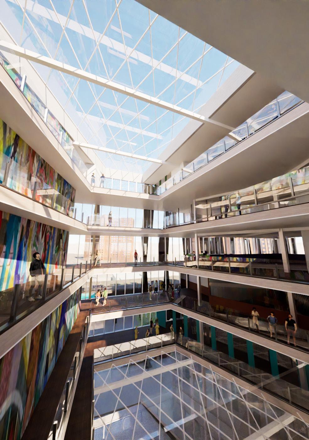 The main lobby opens as a welcoming threshold, where a learning stair and gallery space frame views outward, inviting occupants to engage with both the building and its surrounding context.