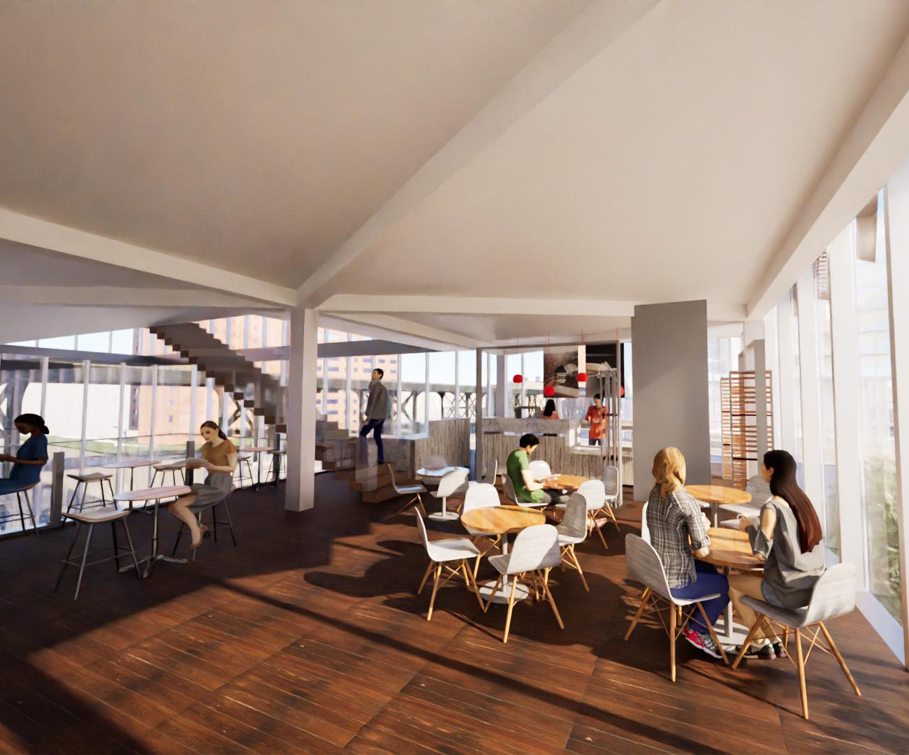 An interior café offers a relaxed setting for pause and gathering, supporting everyday moments of exchange between occupants and the surrounding community.