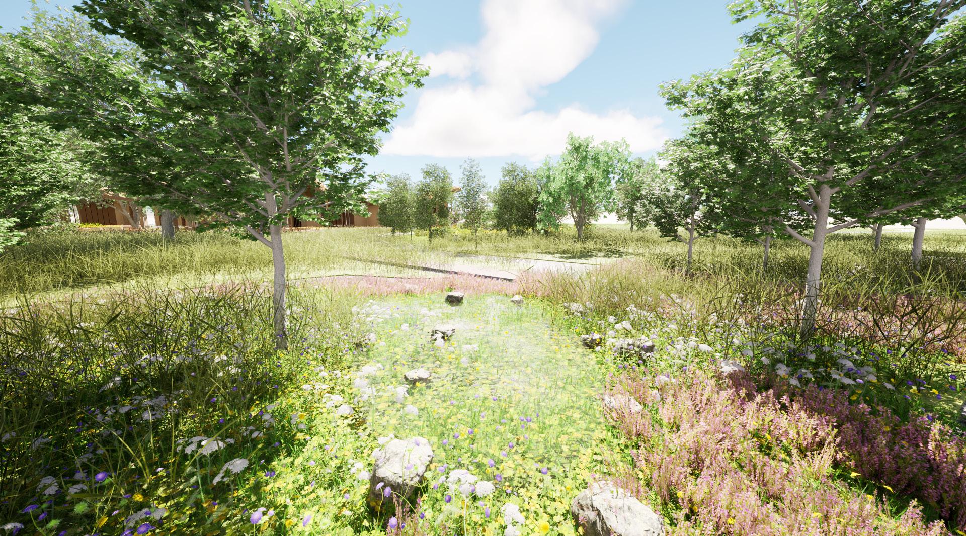 Grass transitions from manicured to managed to overgrowth as the landscape moves away from its focal point. Cultivated areas invite gathering, while the gradual return to wild growth restores the site’s natural character, a gesture of giving land back to itself.