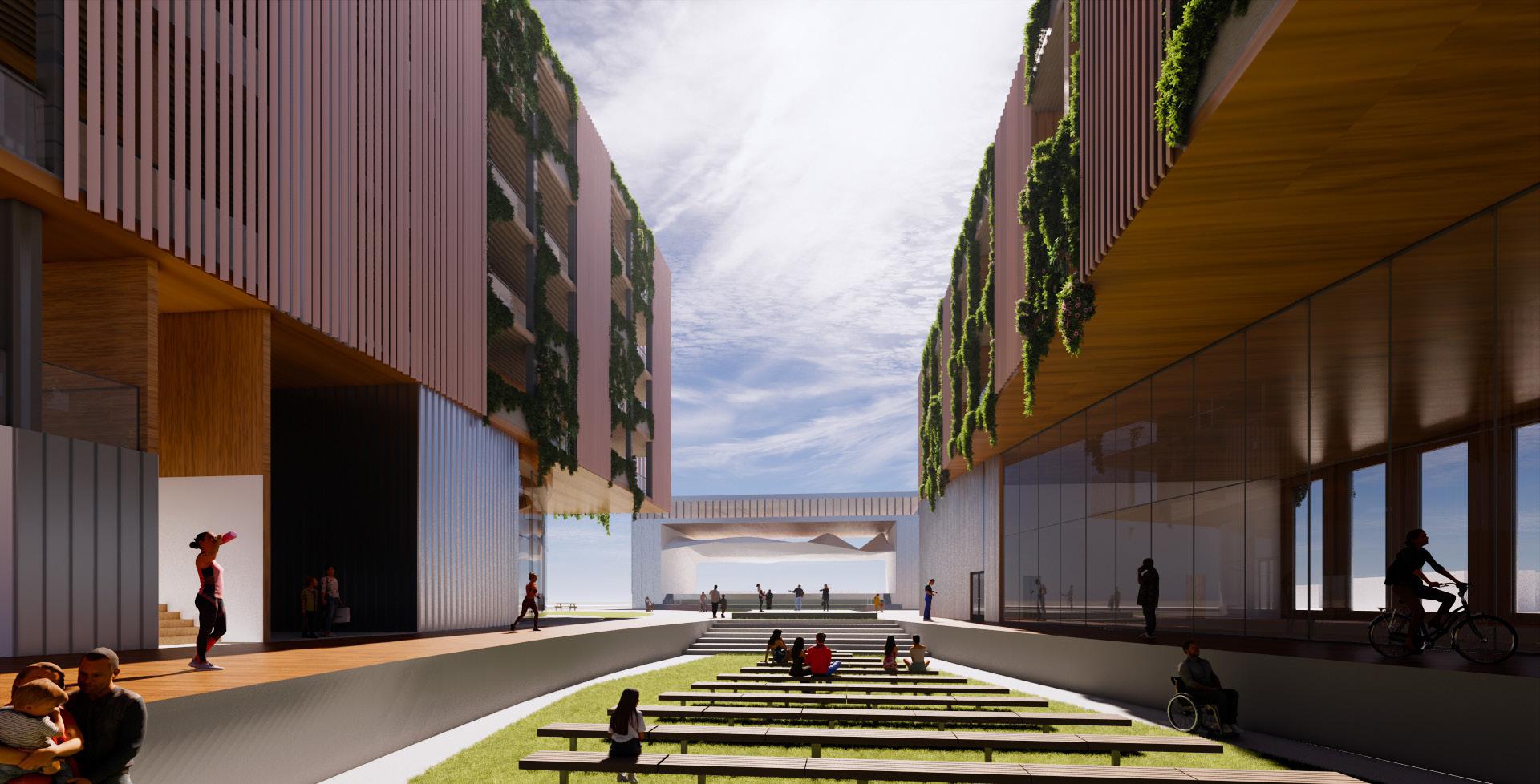 At the midpoint of the loop’s interior green, the space settles into a shared gathering ground, where layered seating and amphitheater views invite pause, connection, and participation, fully accessible to all.