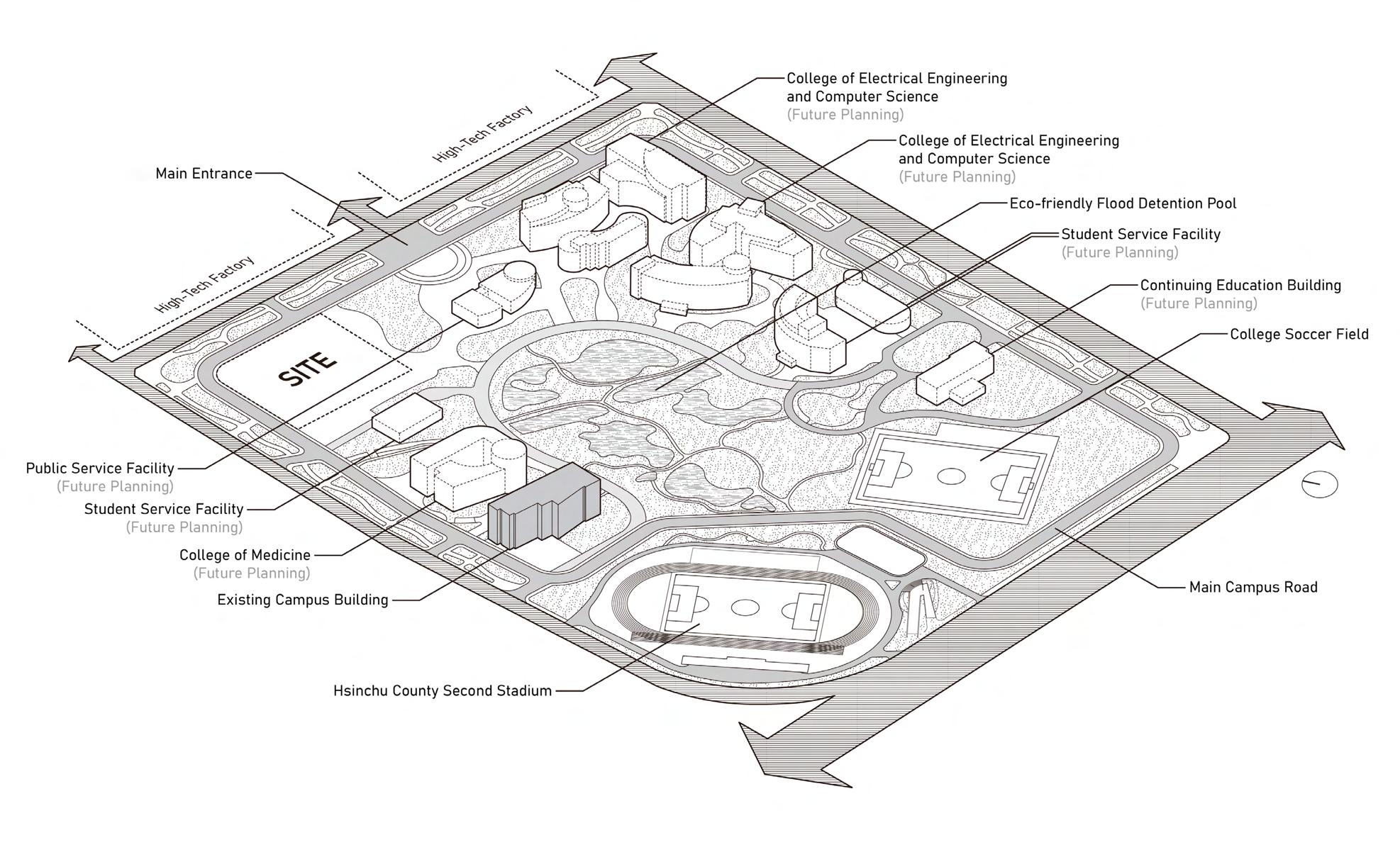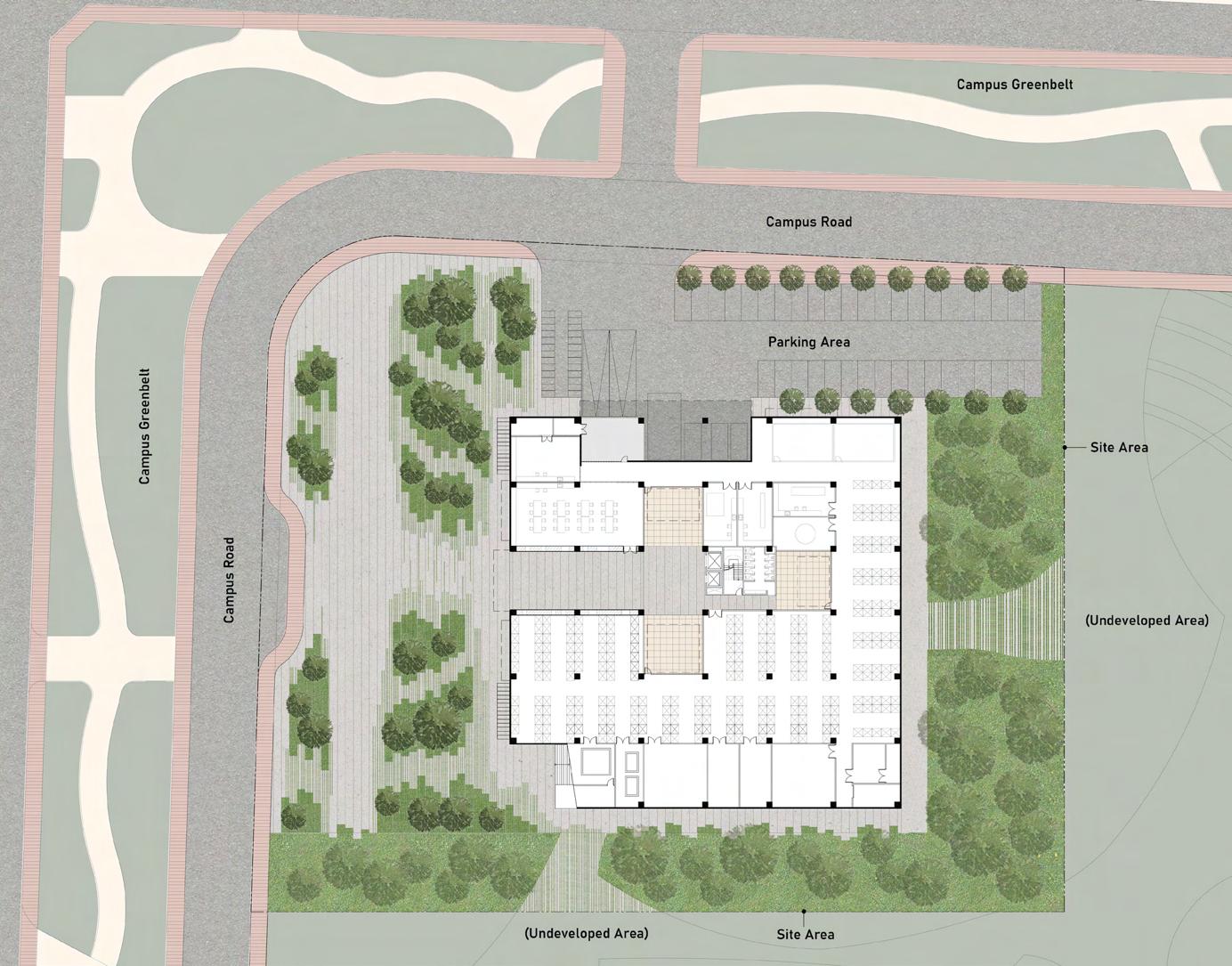 The site of the geosciences building is located at the north-west corner of the 22 hectares-large campus. The main concept of the campus masterplan is to create an eco-friendly learning environment, where low-density buildings are surrounded by natural landscapes and walking paths. Therefore, our core focus is to design a research building that foster great connection with the eco-freindly campus landscape.