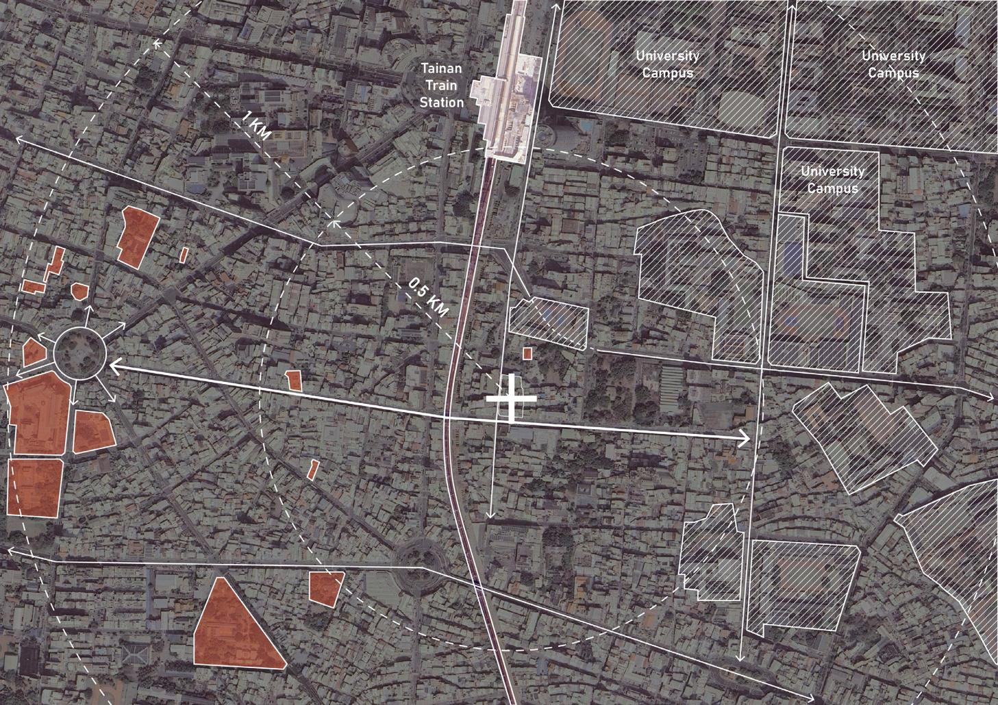 Located in the center of the historical city, the site has several advantages of attracting young tourists. The main train station is not far from the site, and within 1 kilometer, people can easily arrive at several famous historical sites in the west old district of the city. At the north side of the site, an old historic site-The Old Tainan Magistrate Residence-also attracts a large number of tourists. In addition, an old street is crossing through the south part of the site, connecting to the nearby community.