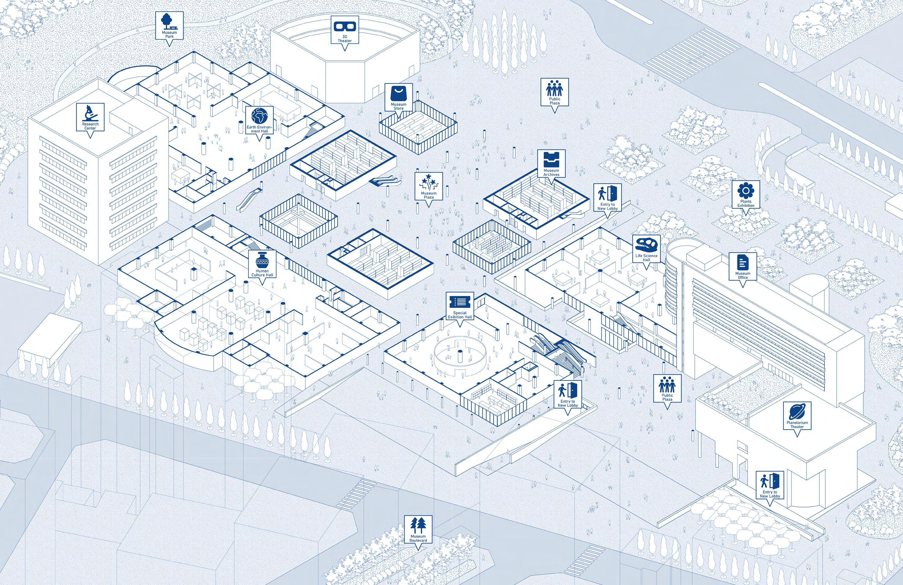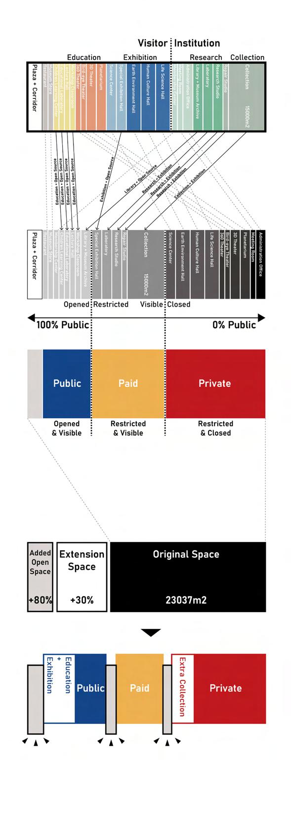 By rearranging the current program into a new hierarchy of privacy, those public programs which were sealed before are now open to the public, such as small exhibition halls, museum library, workshop and lecture hall. Conversely, those private programs which require payment or staff access still remain controlled. Additionally, more public spaces and public programs are added to the new learning center, allowing more public events to take place in the museum campus.