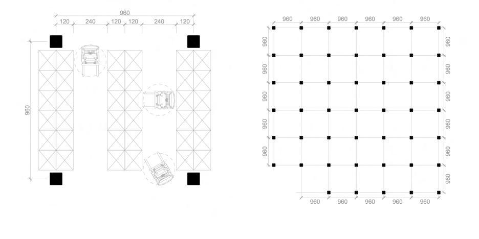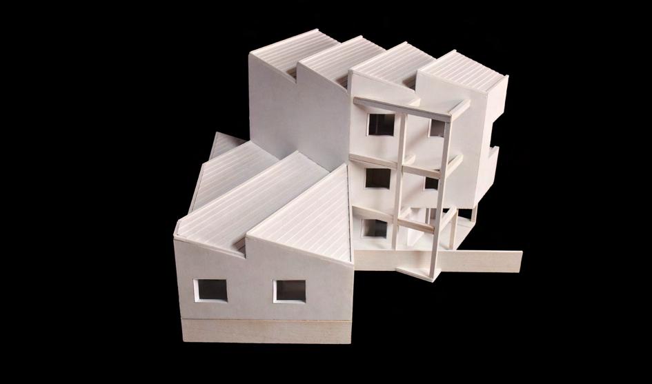 After the installation design, a prototype model is made to develop other ideas of 'inter-oblique'. Two 9x9m squares with different orthogonal systems collided. In one square, the tilted structure system stood independently, forcing an unusual use of the space; In the other square, the exterior wall is cut by a ramp, creating an incomplete interior space.