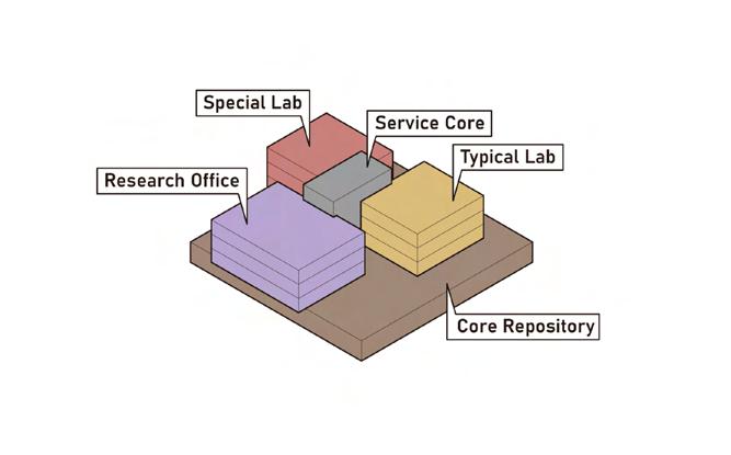 In this highly regulated research center, we strive to maximize openness to the campus. The entrance lobby at the ground floor enables people to walk into the building freely, where the core repository is visually opened to the public, revealing the interior activities to everyone. In addition, a green terrace elevates the greenery to the second floor, inviting people to come and rest. Moreover, sunlights and winds were brought into the building through atrium and semi-outdoor corridors, creating a comfortable learning space.