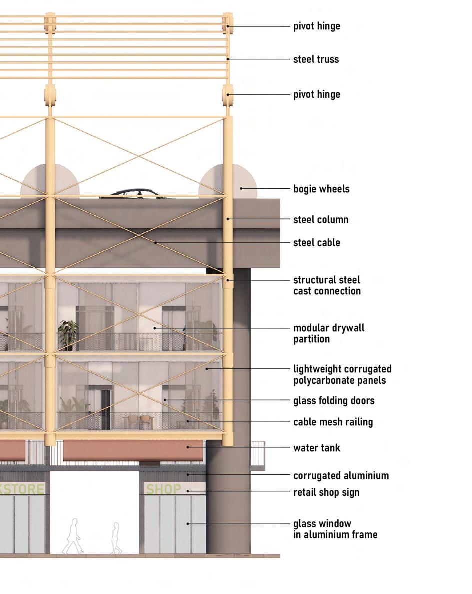 We design a large structural frame with bogie wheels that stands on the expressway, several apartment units are hung beneath it. While moving, service spaces such as bathroom units and water tanks will be removed to reduce the loading. Therefore, the whole building can move along the expressway freely. After the Transient Metropolitan Residence is positioned, those parts will be reinstalled to the living units.