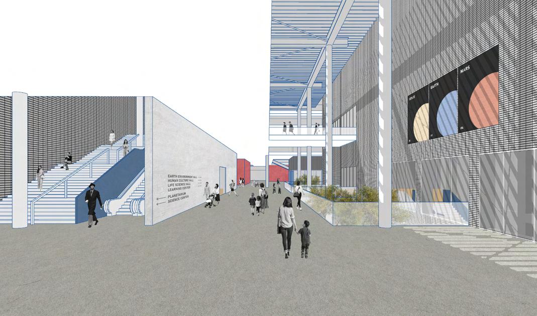 The large sunshade extending from the planetarium theater to the new learning center creates a comfortable semi-outdoor corridor that connects the separated exhibition halls. After visiting one hall, visitors can walk outside along the ground floor or the corridor to another hall. Therefore, the visiting circulation doesn't just stay in the monotonous indoor space. Instead, people can shuttle freely between indoor and outdoor spaces.
