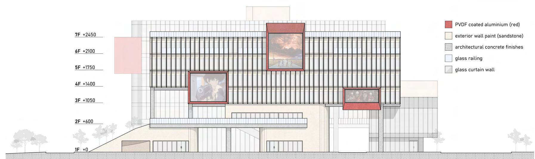 The vertical sunshade block out direct sunlights, reducing the energy consumption of indoor air conditioning. Red aluminum panel are used as the exterior wall material of plug-in theaters, setting the lively tone of the hotel facade. Moreover, movie scenes can be projected at the glass curtain wall of the theater, showcasing the diverse content of the Netflix.
