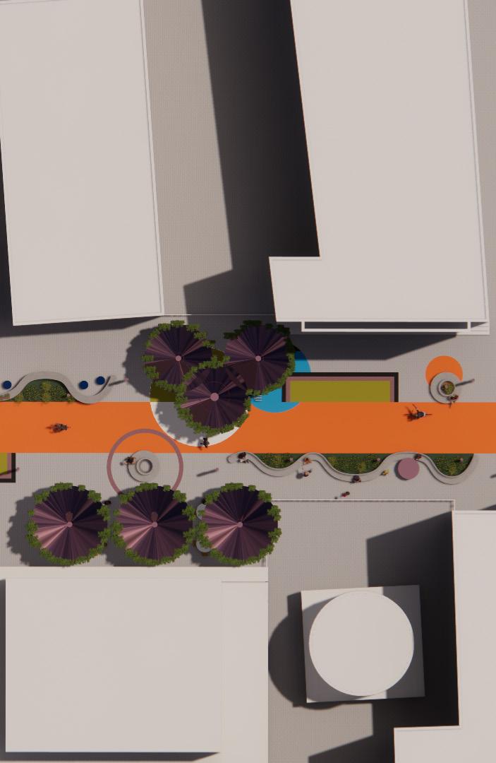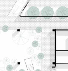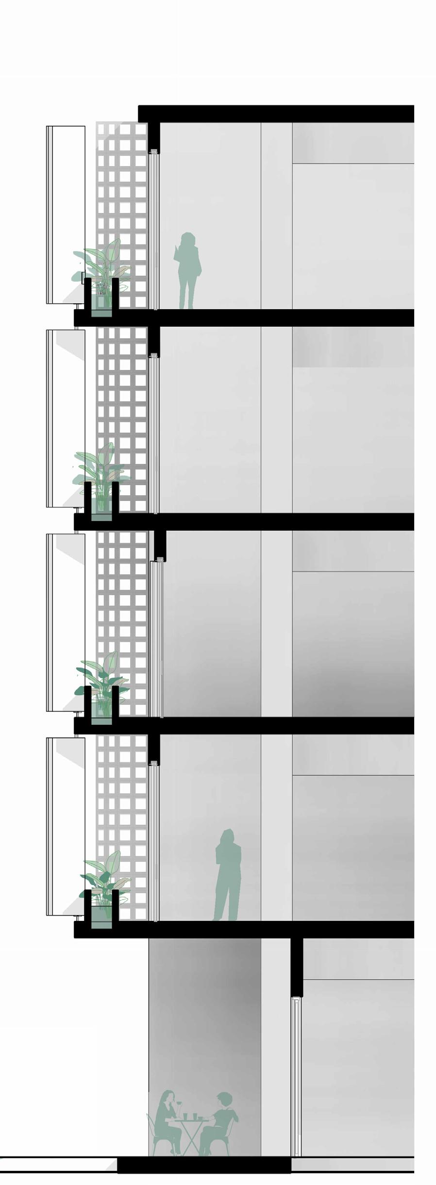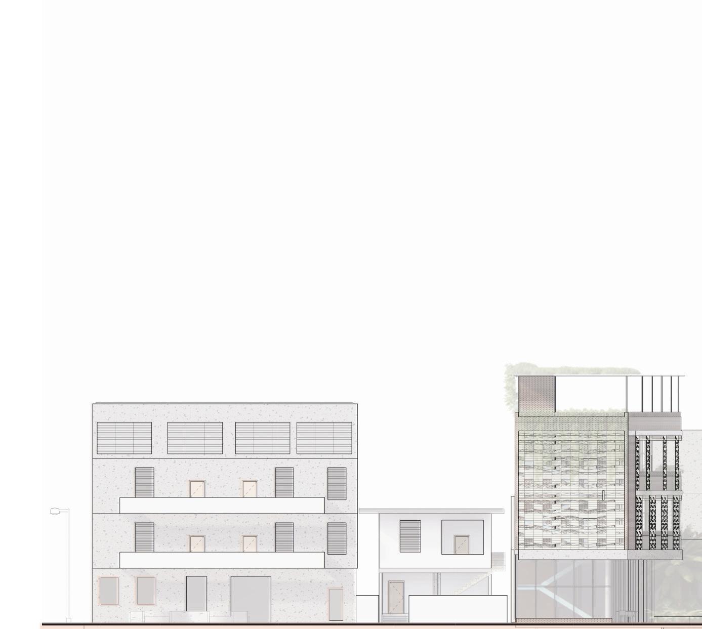 Adjacent to the residential buildings, a cluster of old structures would be repurposed as a restaurant, daycare, and community workshop. Residential and commercial spaces are connected through green areas and shapes that harmonize with the new façade, forging a link between the old and the new. These green areas not only provide noise reduction for residential spaces but also offer a natural sanctuary within the urban environment.