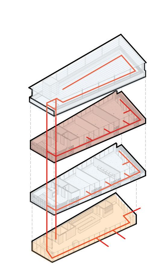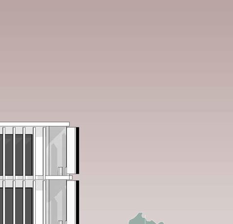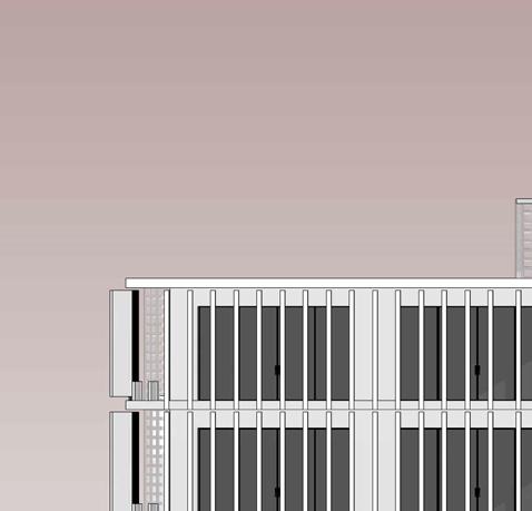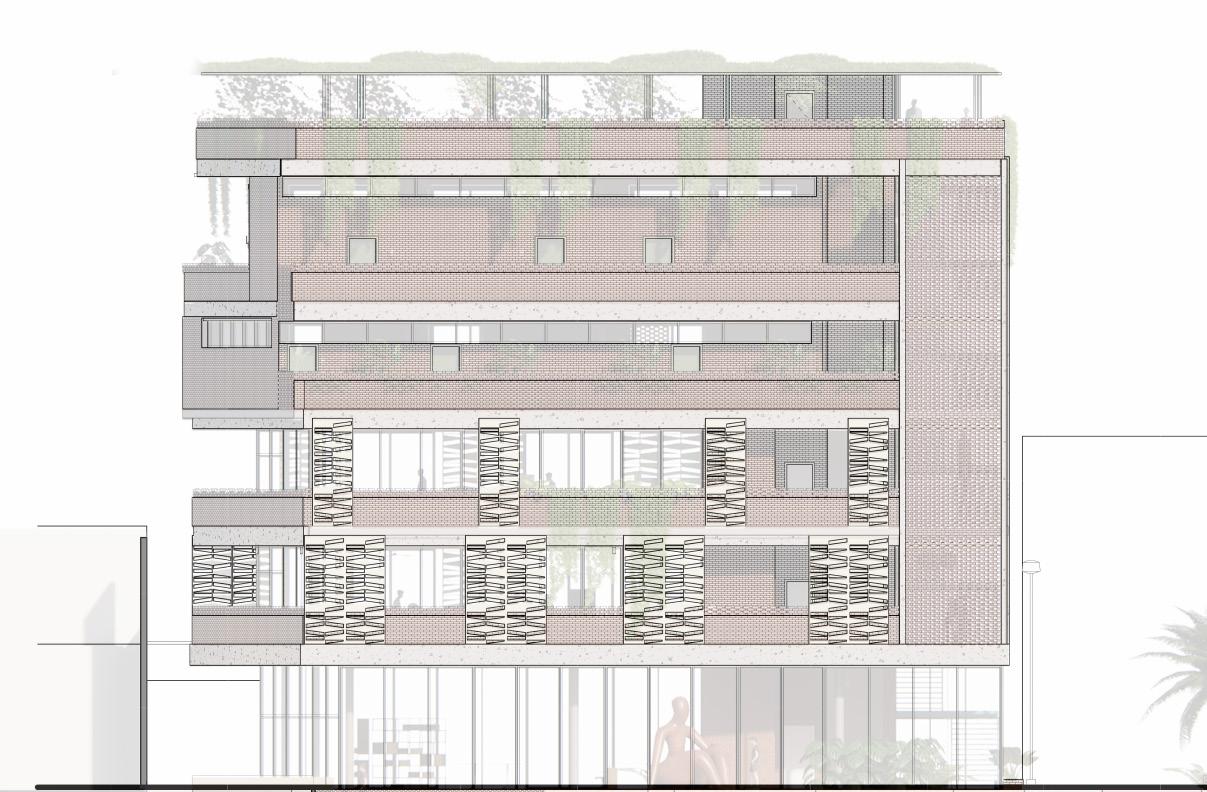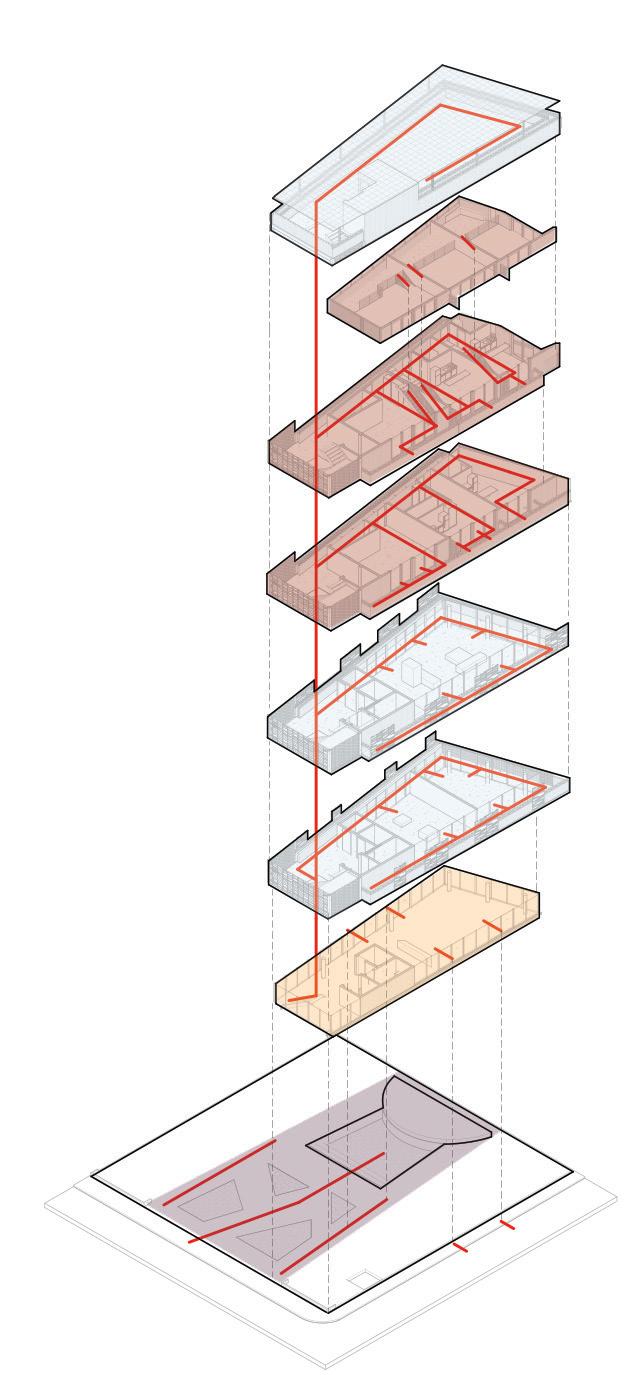 The Old Department of Health building would primarily serve as housing, with the first level of the front façade dedicated to office rentals. To increase the available housing area, an “extension” of the building is proposed. Starting from the inner courtyard, this extension connects to the new building while also utilizing an inverted and rotated patio design to create residential modules. This shape forms a curved façade that complements the old building while respecting its volume and original structure.
