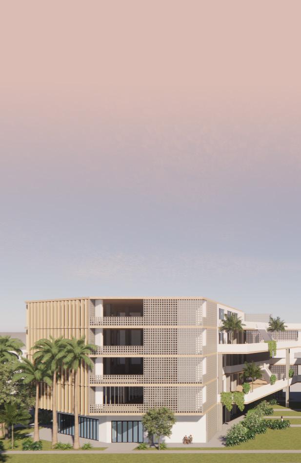 A wooden brise-soleil, breeze blocks, and extensive vegetation celebrate the tropical location while protecting the building from excessive heat gain.